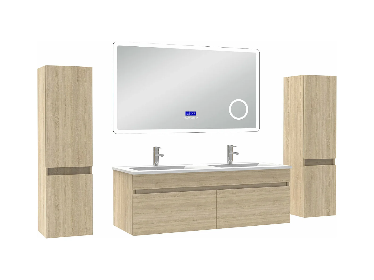AICA Ensemble meuble Salle de Bain Chêne Wotan 120cm avec 2 colonnes, double vasque et Led miroir dimmable avec 3 couleurs, Bluetooth et 3X grossissement.