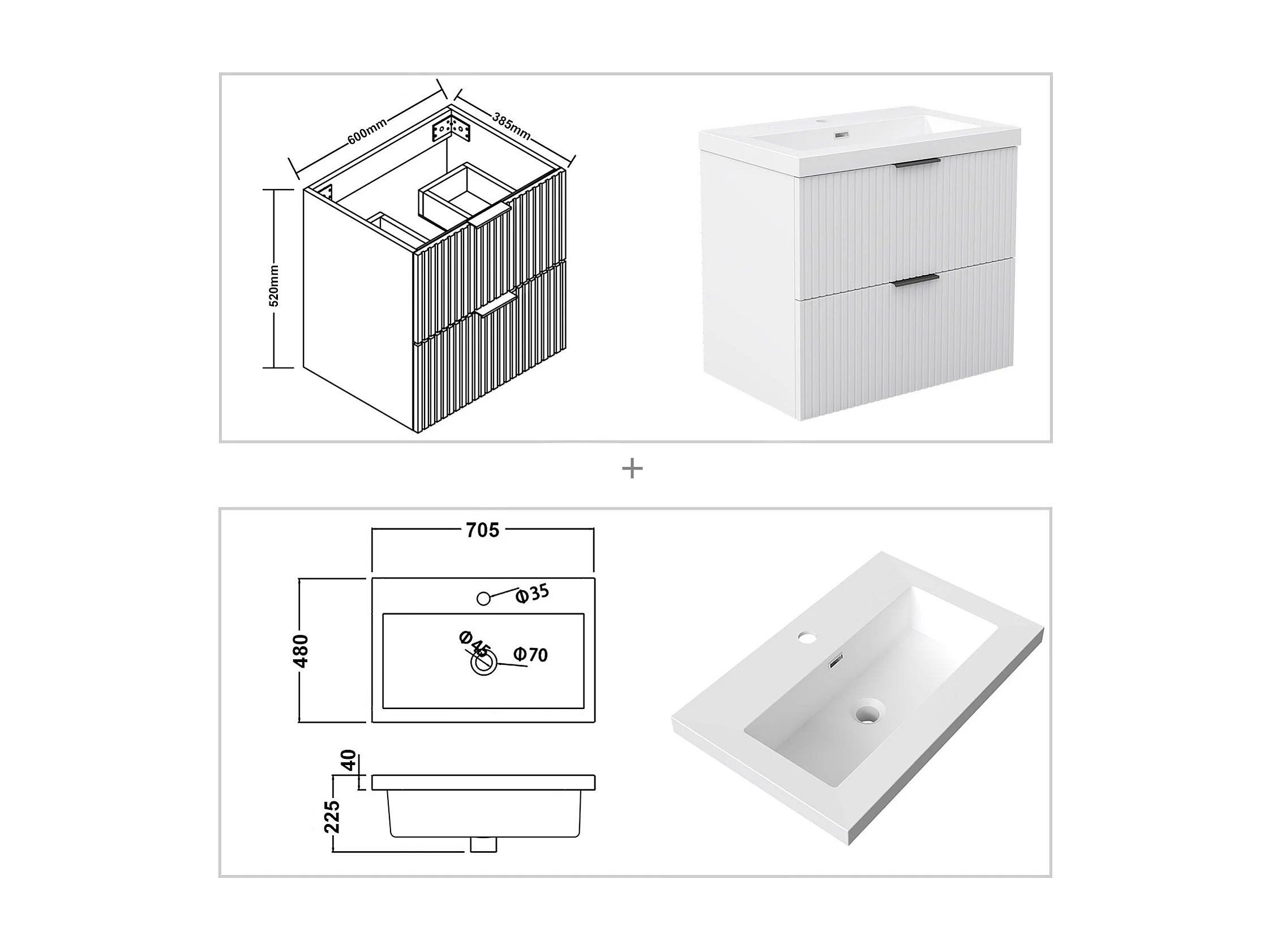 AICA Ensemble salle de bain suspendu 60 cm Blanc - Avec 2 tiroirs + vasque