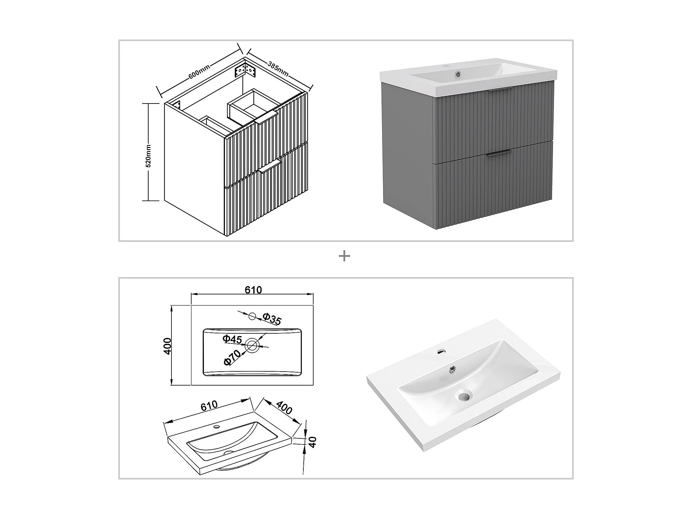 AICA Ensemble salle de bain suspendu Anthracite 60 cm avec 2 tiroirs, vasque inclus