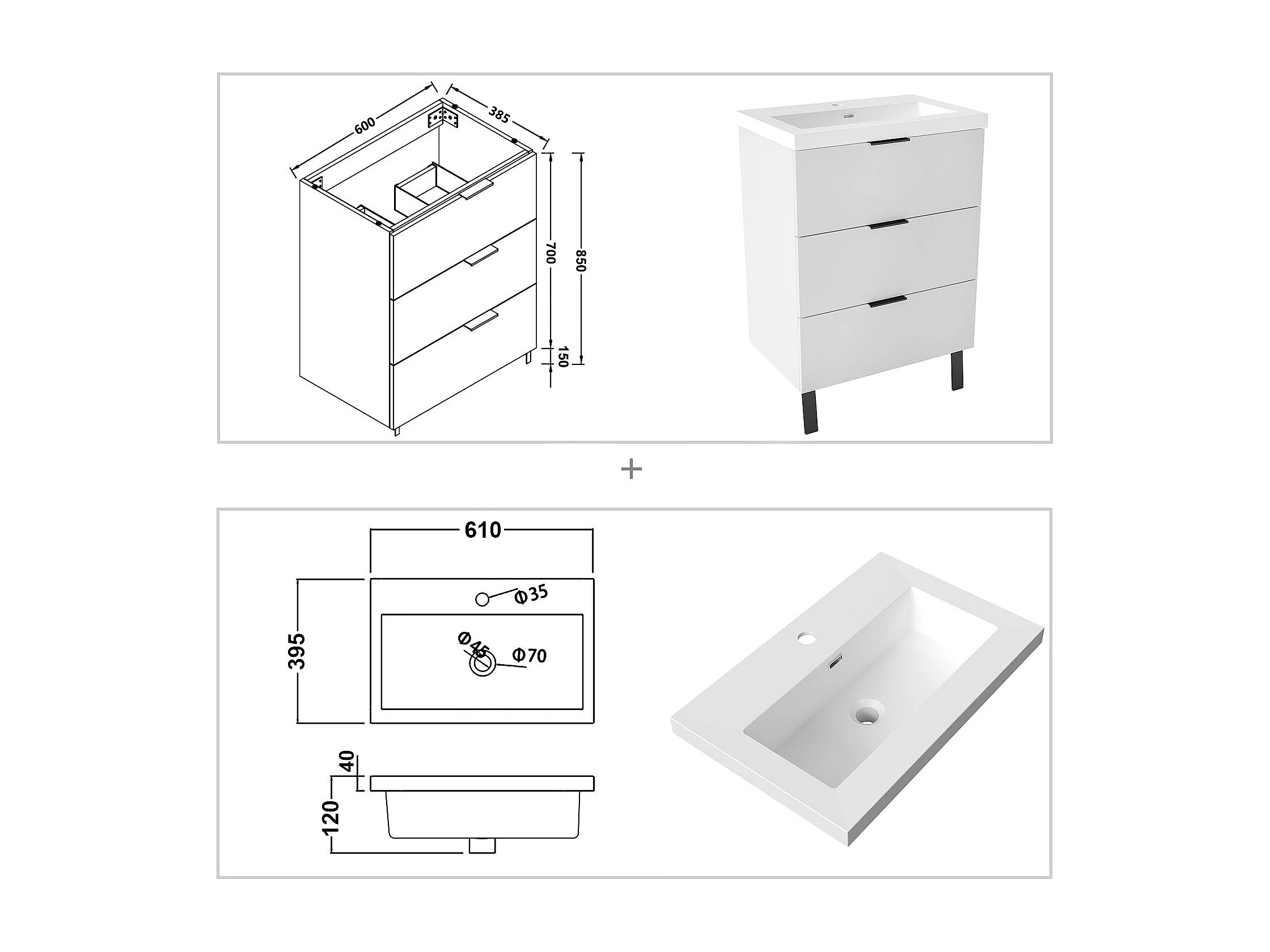 AICA Meuble salle de bain 60cm avec 3 tiroirs + 2 Pieds, Meuble simple vasque, Blanc