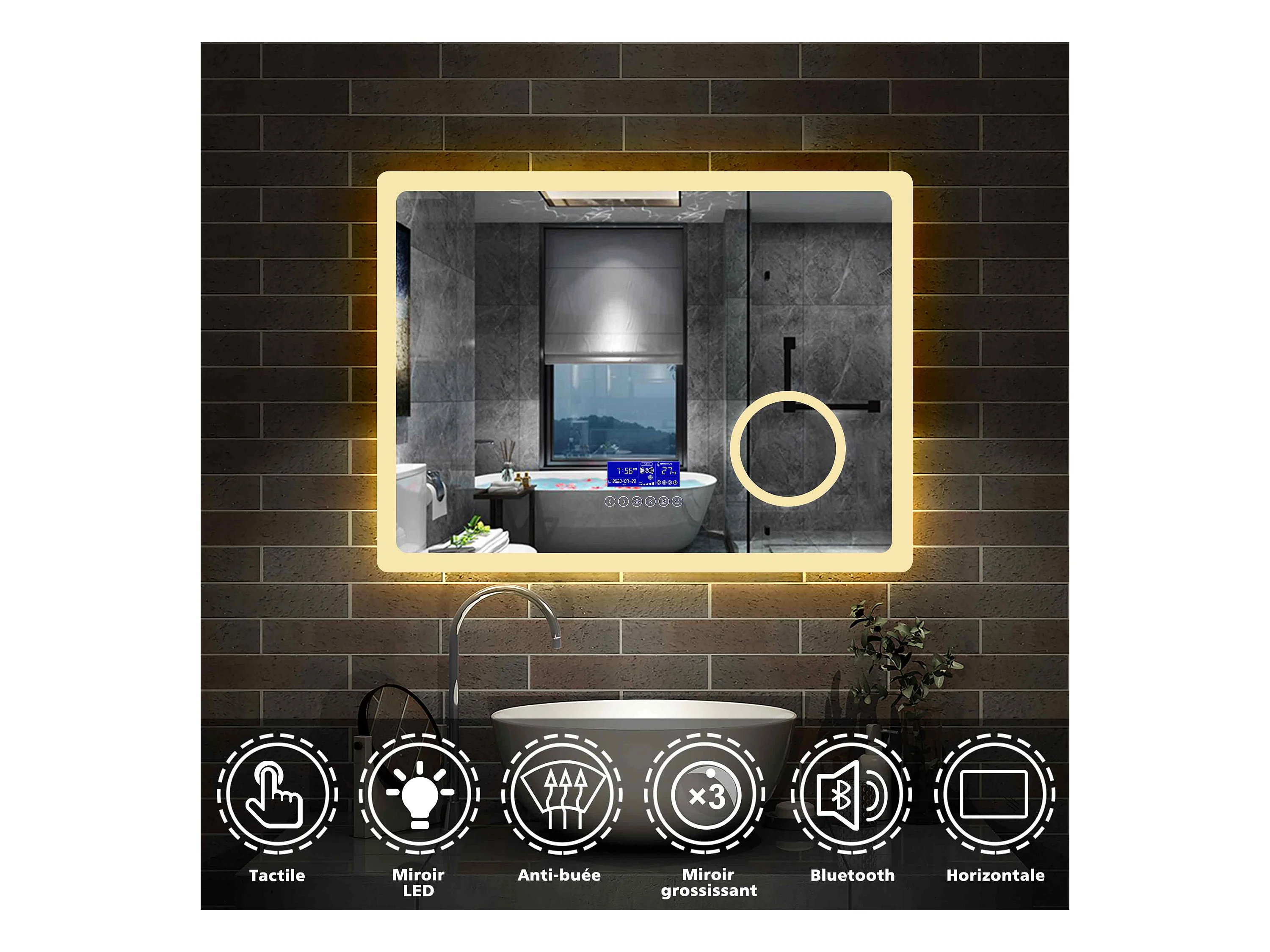 Miroir salle de bain 80x60cm LED réglable+antibuée+Bluetooth+Horloge+grossissant Aica