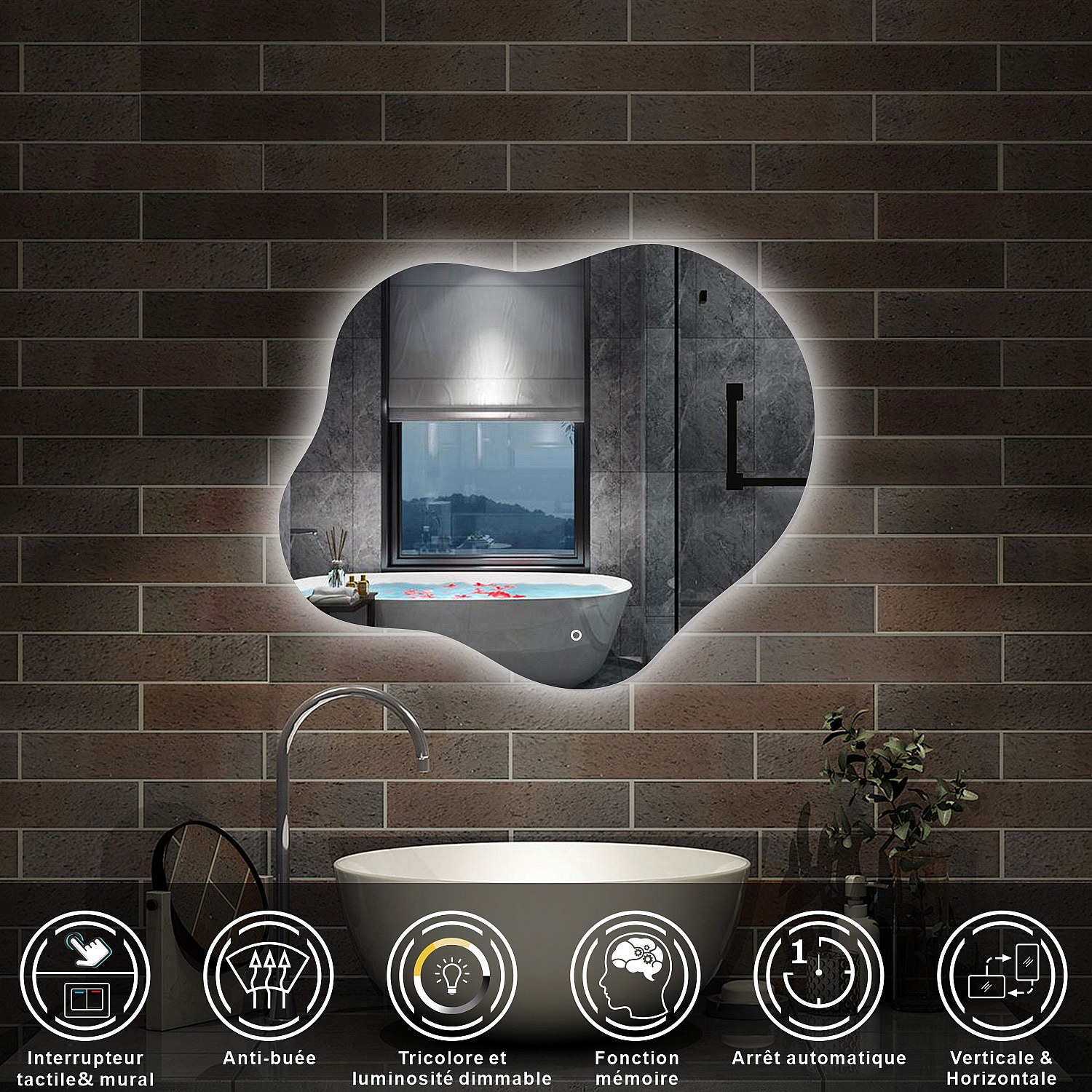 AICA Miroir de salle de bain en forme de nuage 80×55cm, rétro-éclairage, Design Asymétrique, 3 Couleurs + Dimmable + Anti-buée + Mémoire