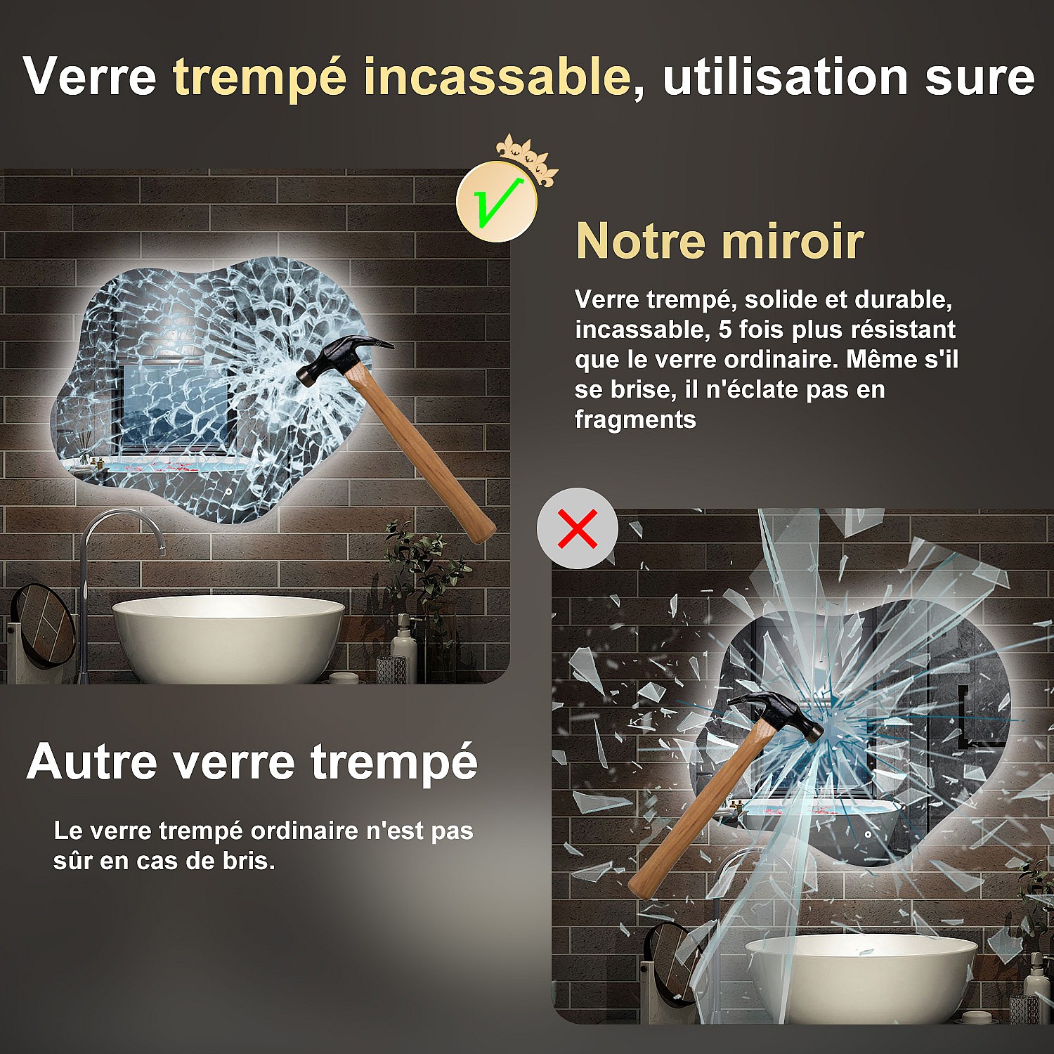 AICA Miroir lumineux Asymétrique LED 100x80cm, Teardrop Mirror, Tricolore + Dimmable + Anti-buée
