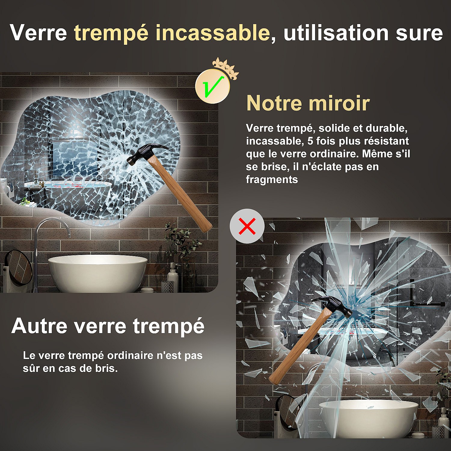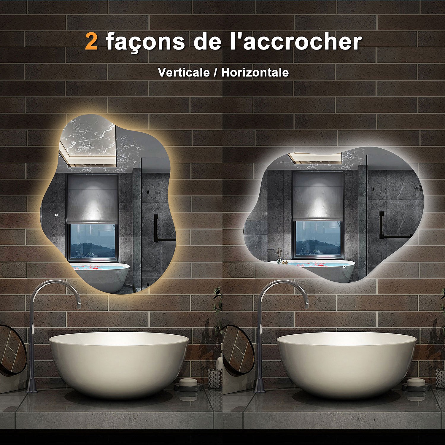 AICA Miroir lumineux Asymétrique LED 100x80cm, Teardrop Mirror, Tricolore + Dimmable + Anti-buée