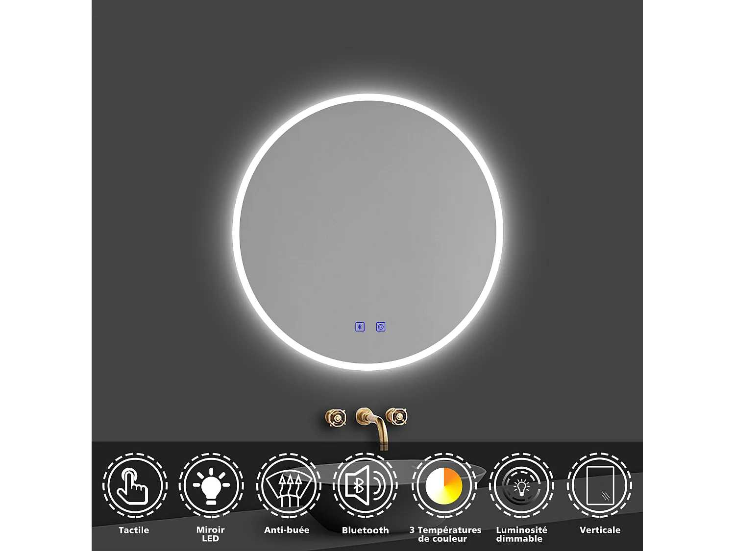 Aica Miroir lumineux rond, l.70 x H.70 cm, Miroir LED avec antibuée