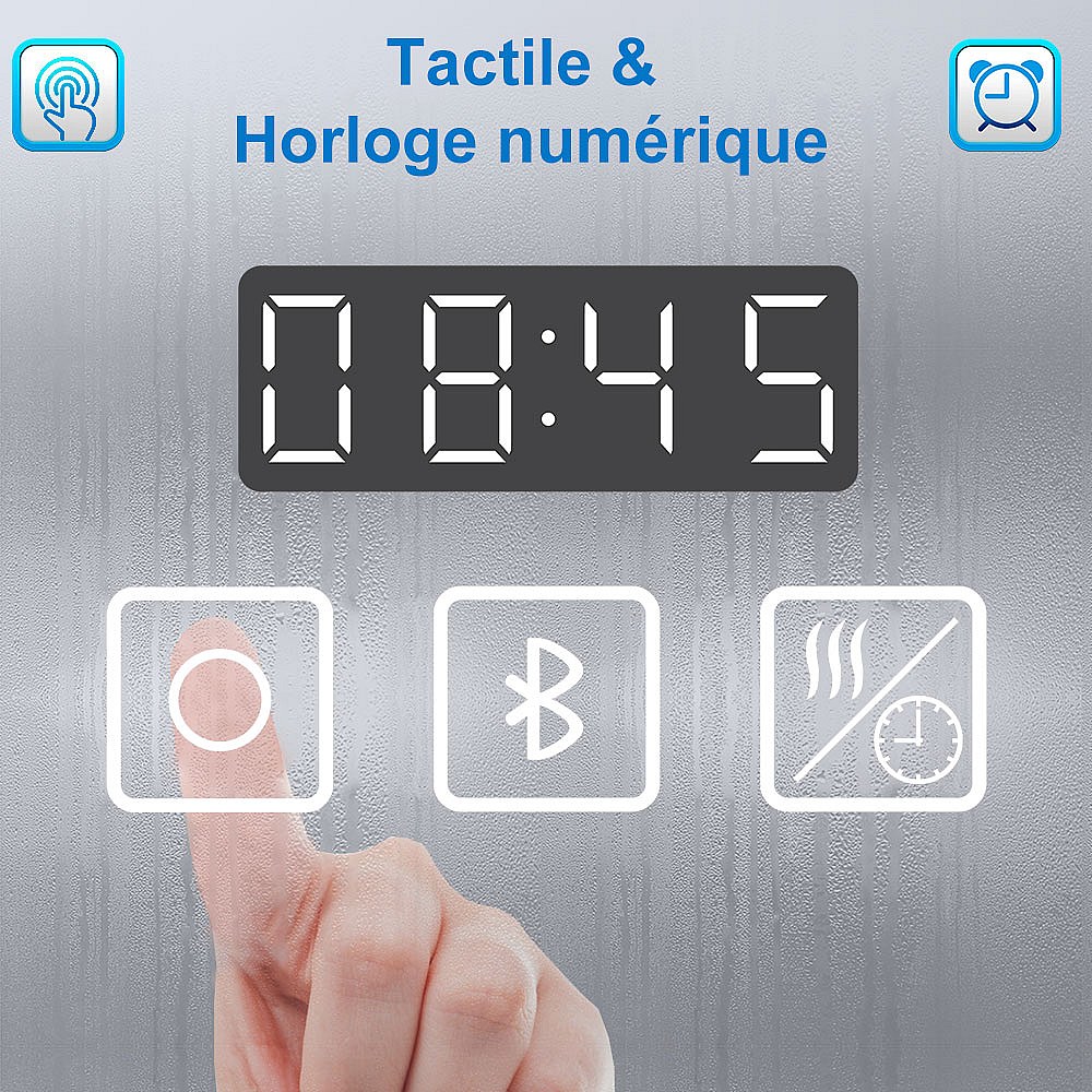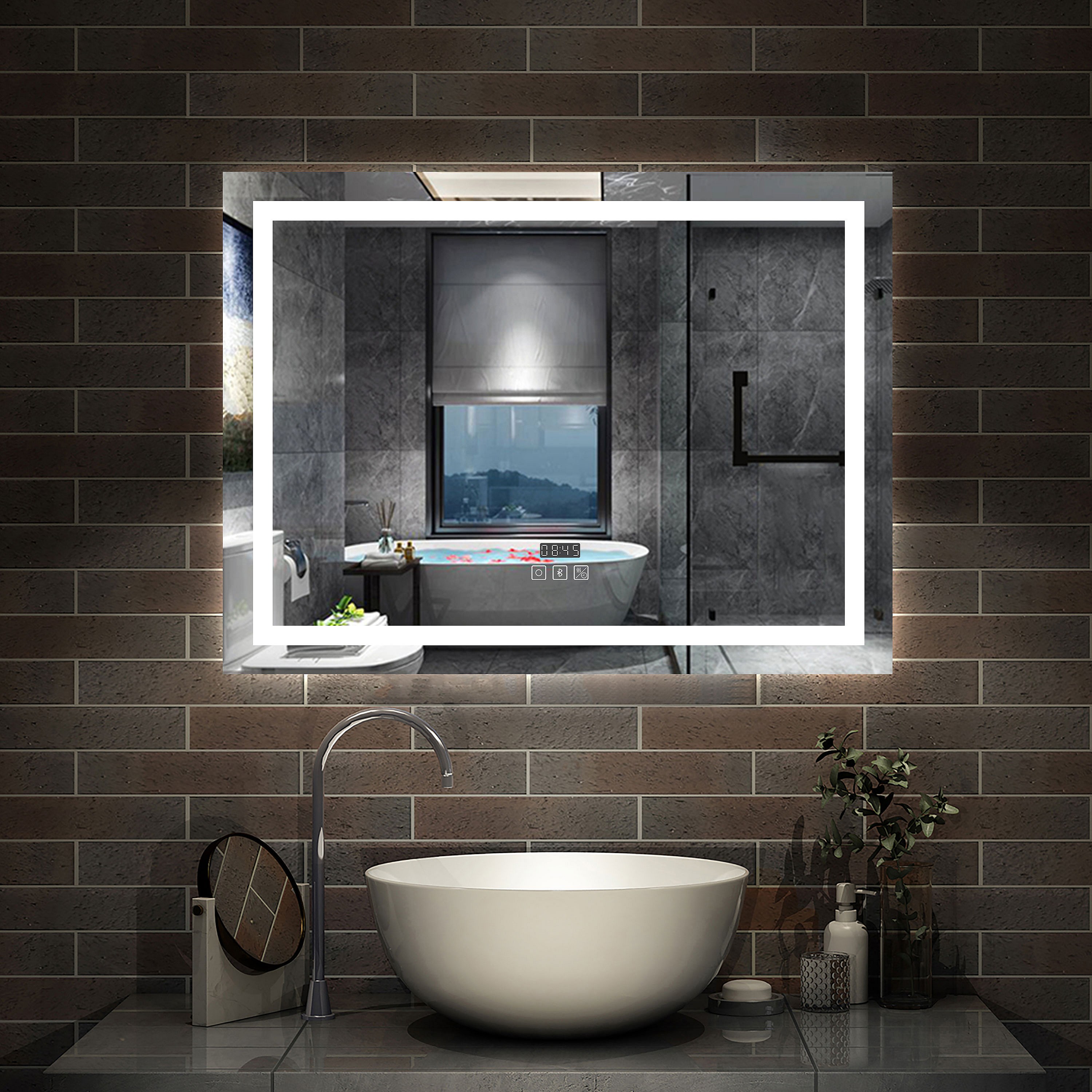 AICA Miroir de salle de bain Lumineux Bluetooth 100x60 cm, 3 Colours et Horloge et Dimmable et Anti-Buée