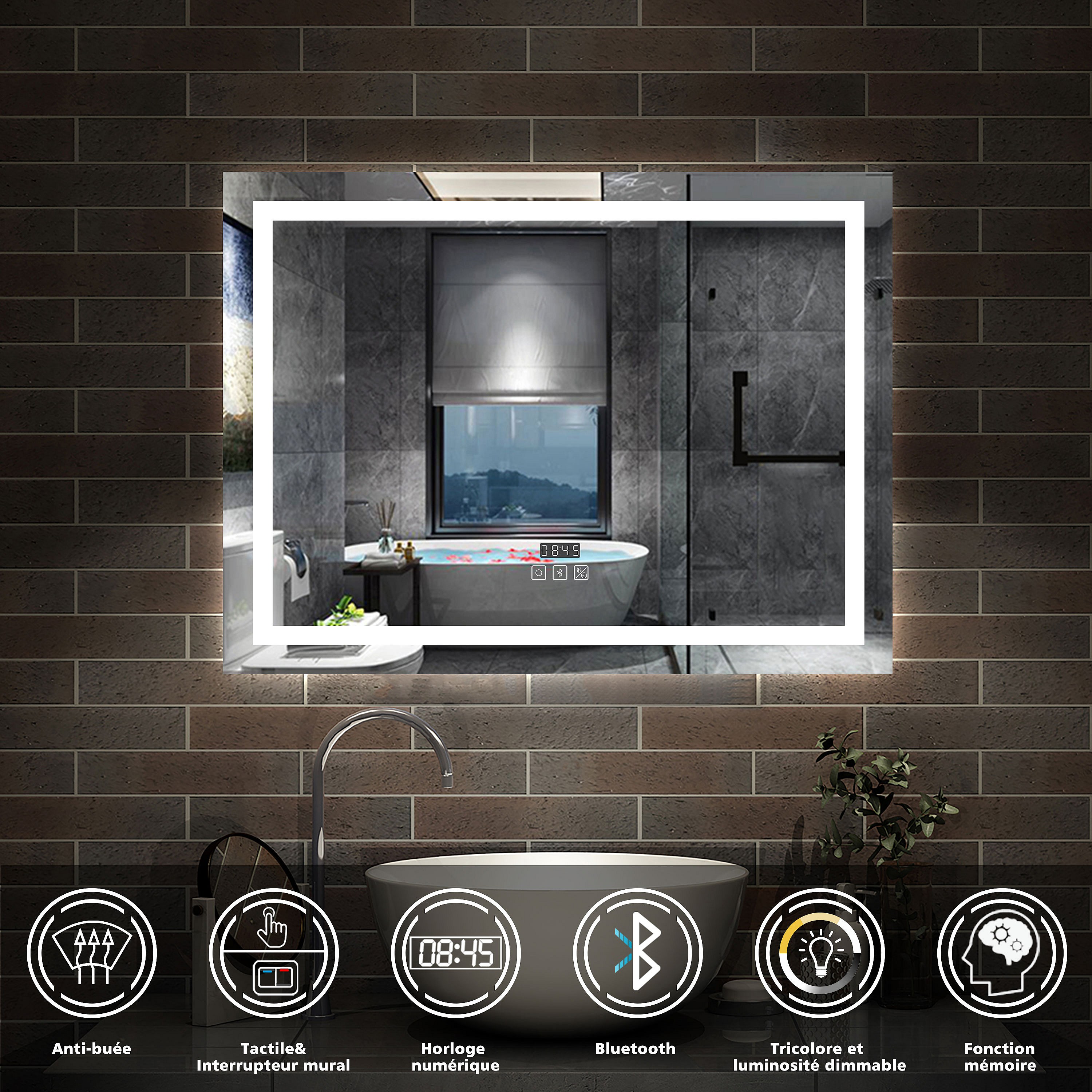 AICA Miroir lumineux à LED 80x60cm, Dimmable et Mémoire, Anti-Buée, Miroir de salle de bain