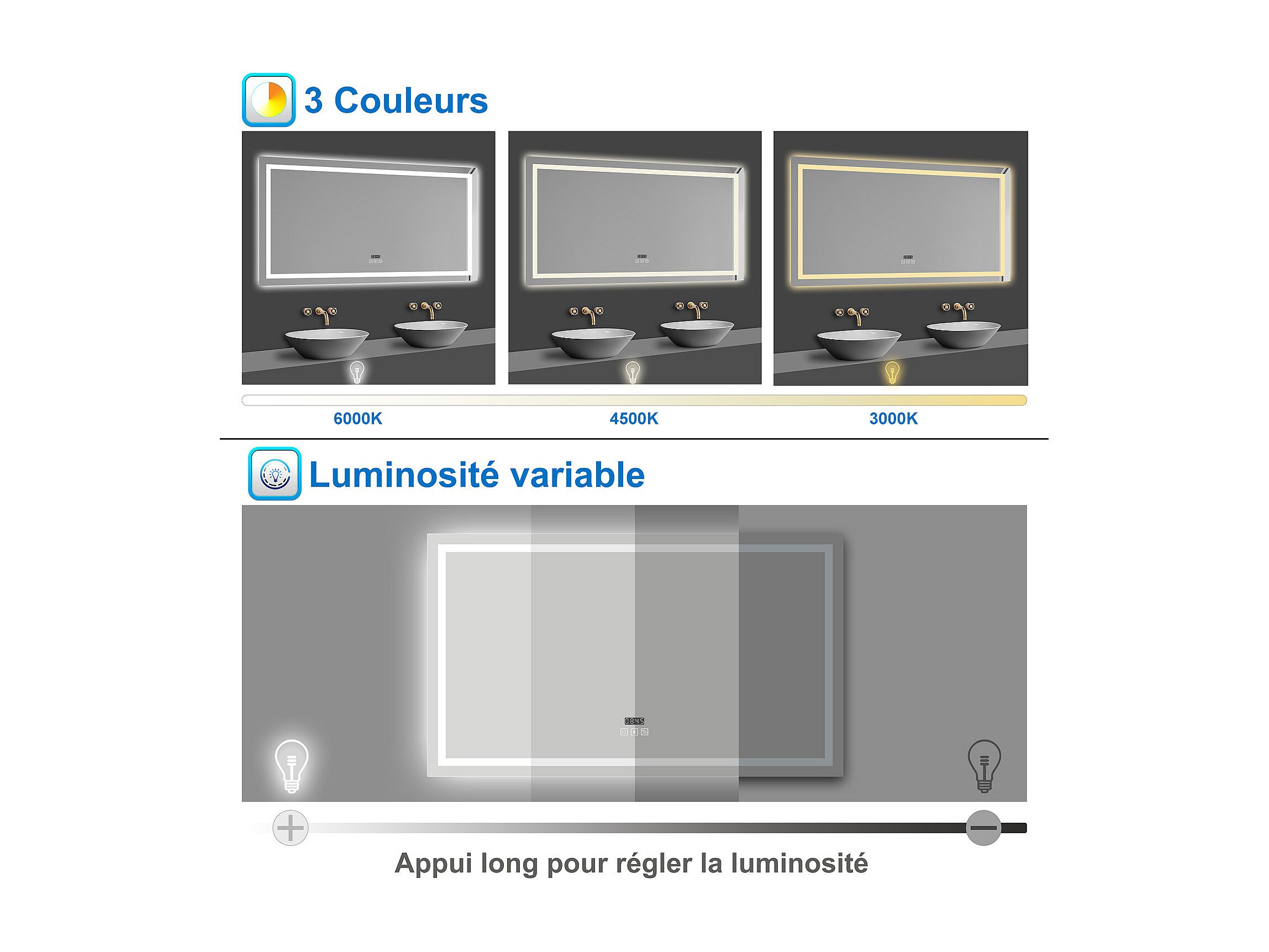 AICA LED Miroir lumineux 80x60cm 3 couleurs + anti-buée + dimmable + mémoire miroir salle de bain
