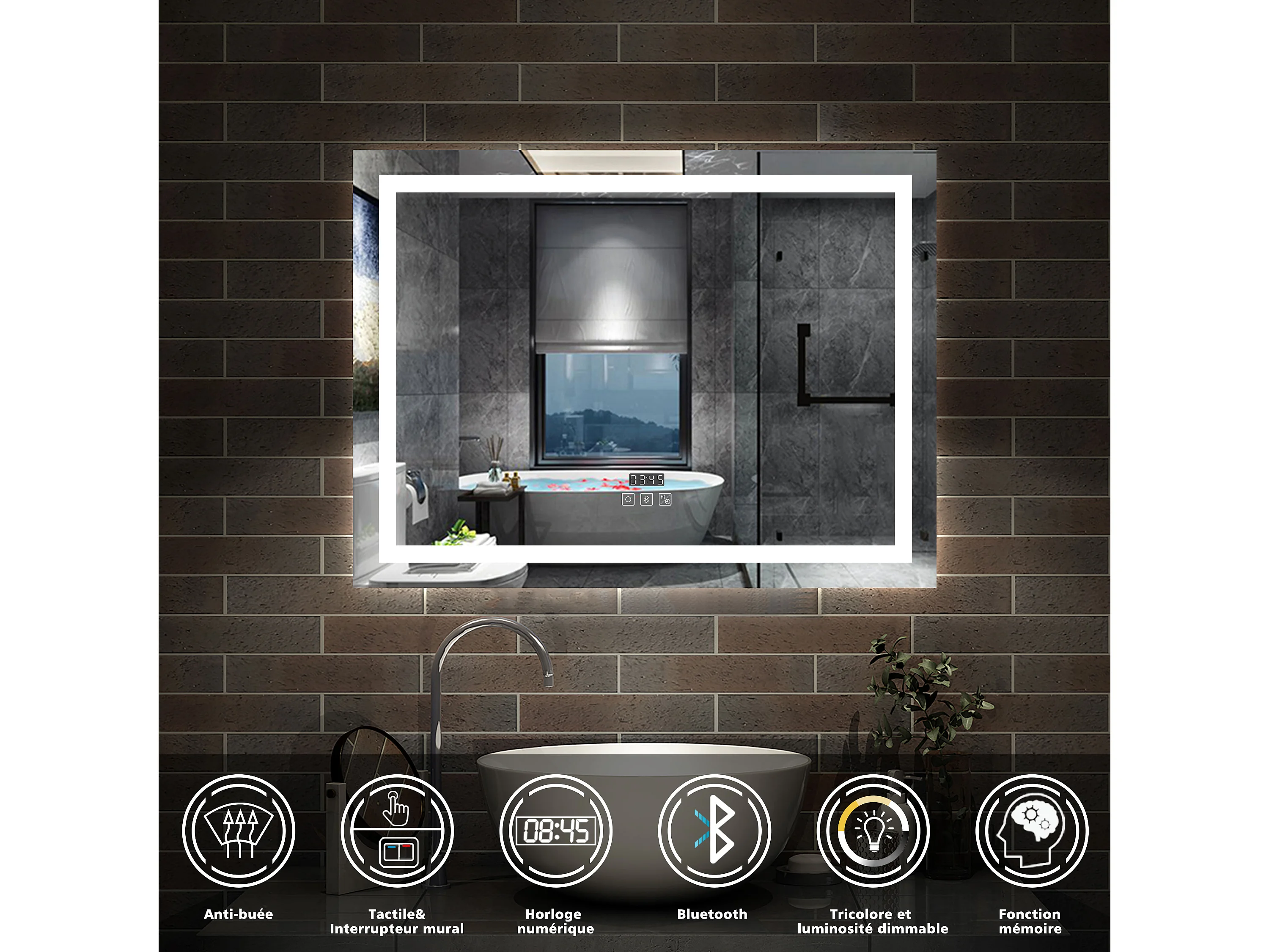 AICA Miroir de salle de bain Lumineux Bluetooth 80x60 cm, 3 Colours et Horloge et Dimmable et Anti-Buée