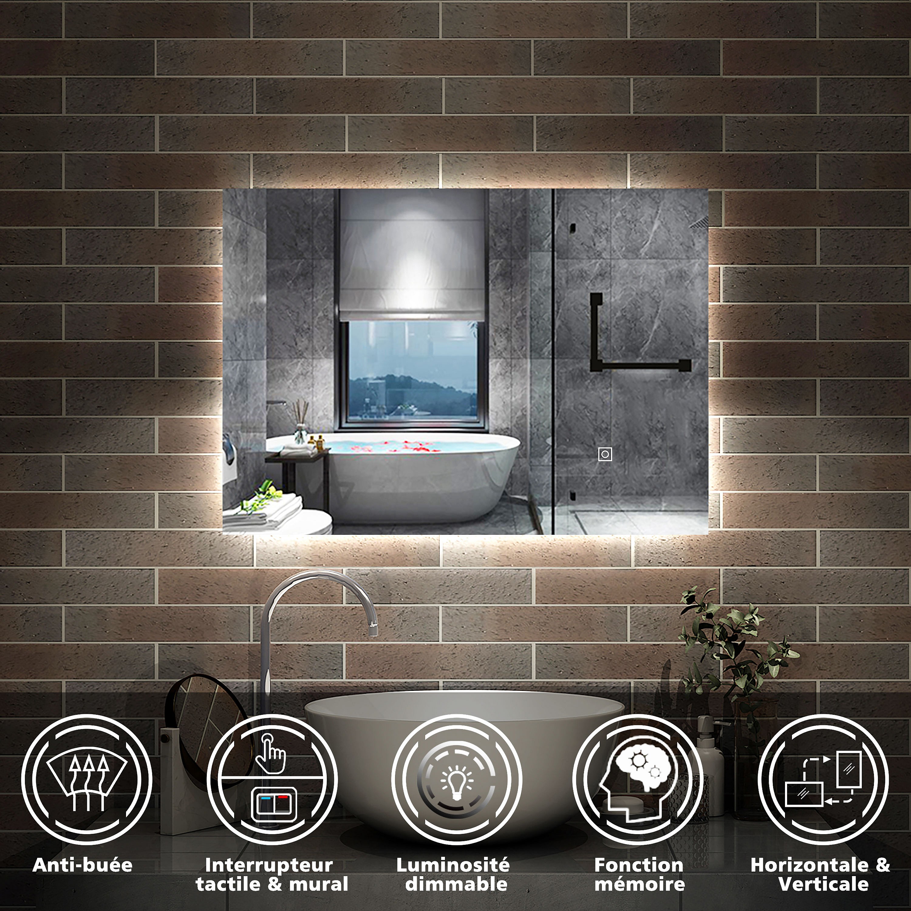 Miroir LED 80x60cm avec Anti-buée + Dimmable, Mural Miroir salle de bain