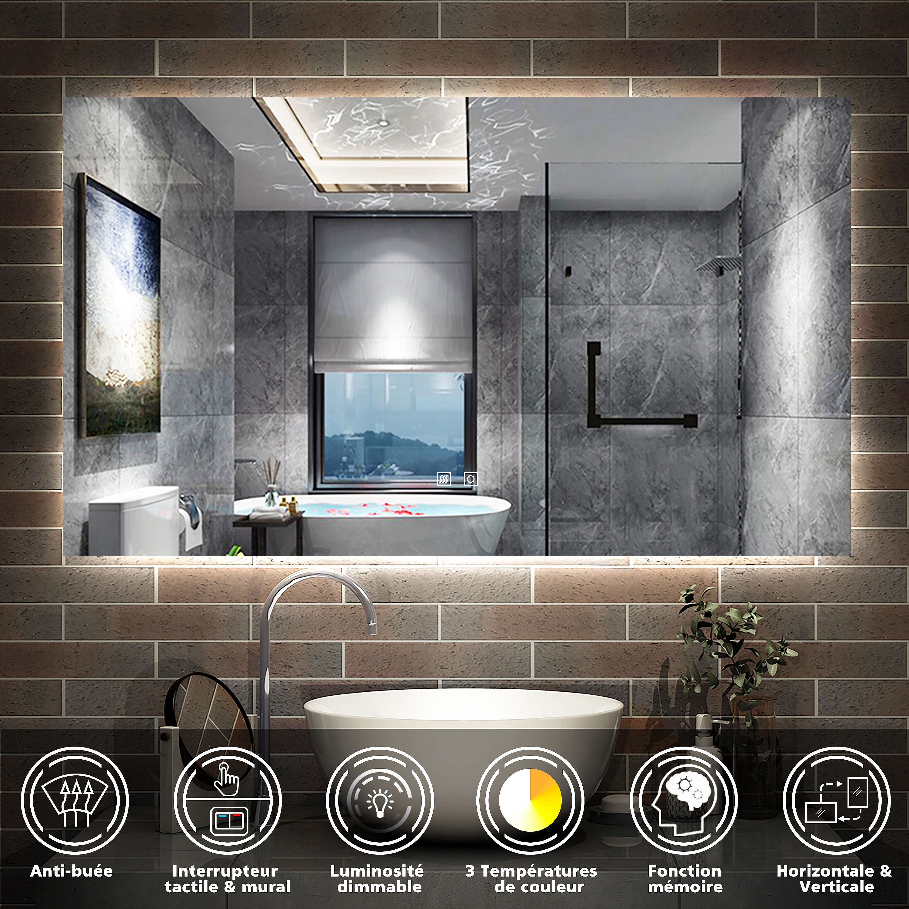 Miroir LED 100x60cm avec Anti-buée + Dimmable, Mural Miroir salle de bain