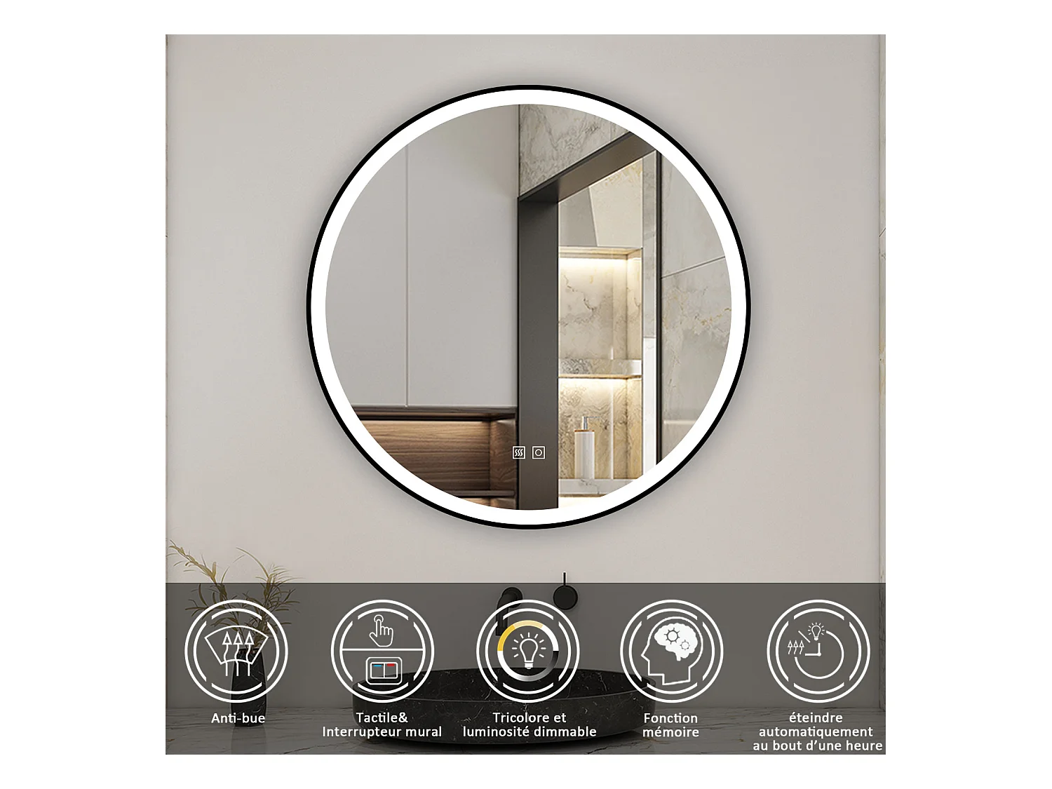 AICA Miroir de salle de bain LED rond 80cm avec cadre noir, tricolore + anti-buée + mémoire + gradation infinie