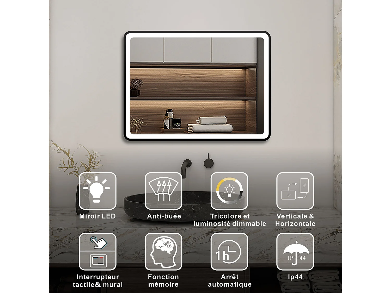 AICA Miroir lumineux 80x60 cm avec 3 couleurs + dimmable + anti-buée + mémoire, miroir salle de bain led