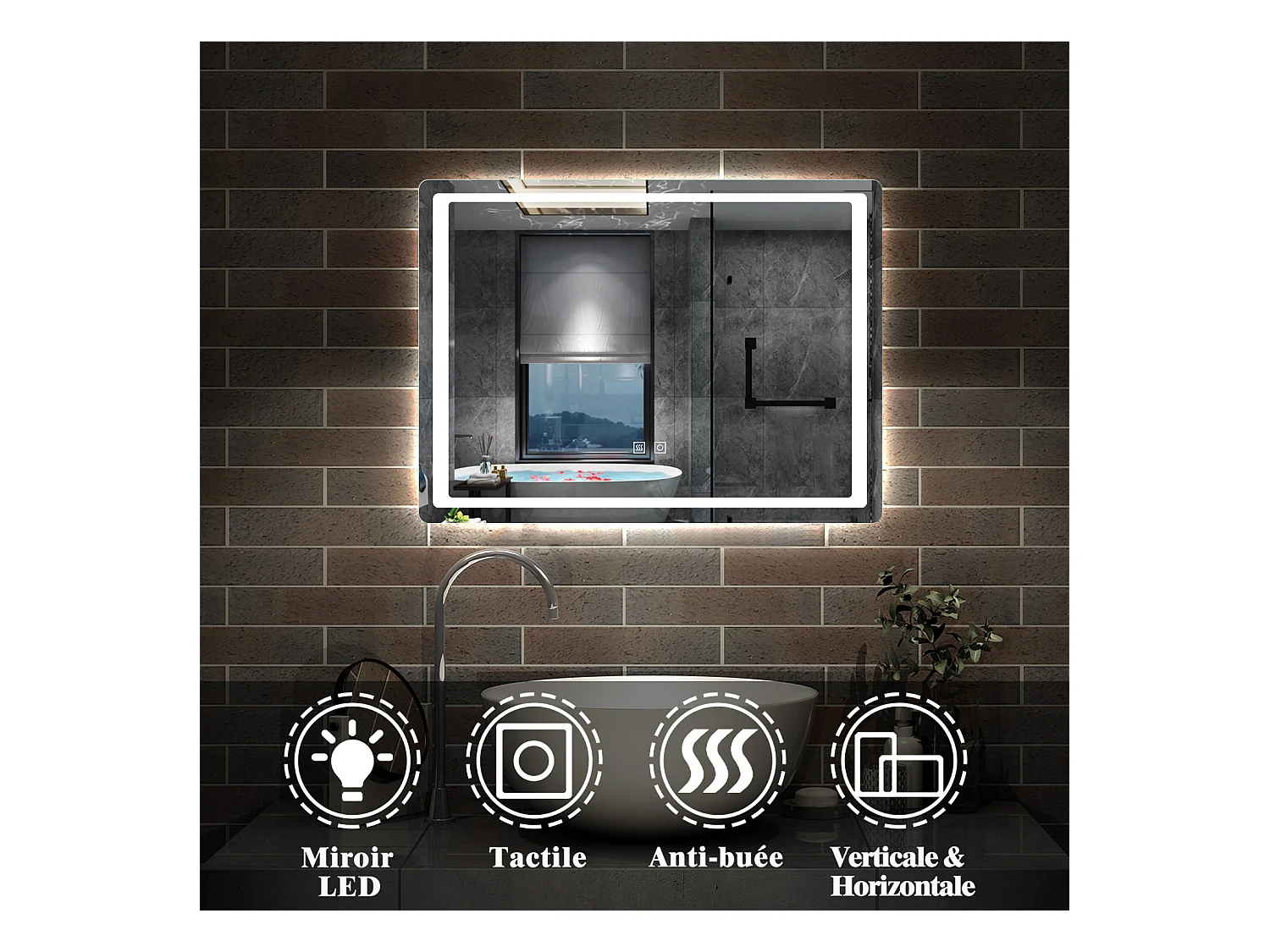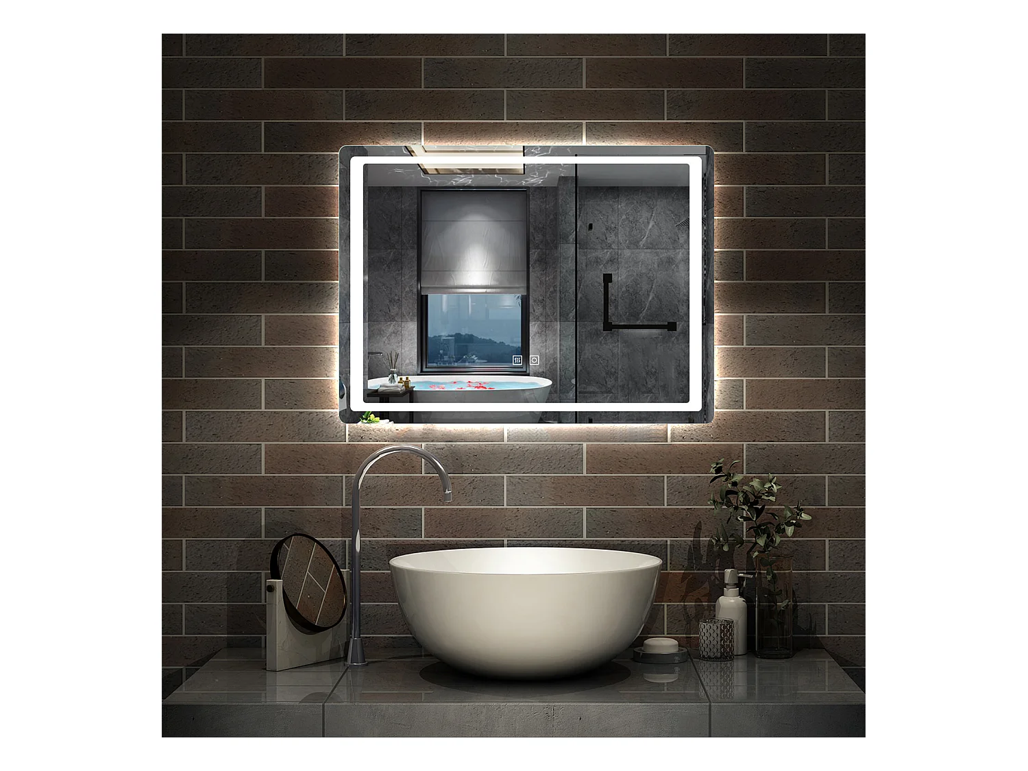 AICA Miroir LED 80x60cm avec éclairage intégré avec anti-buée, Modèle soleil