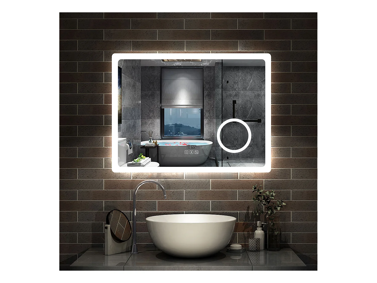 AICA Miroir salle de bain Bluetooth 80x60cm Lumineux 3 Colours et Dimmable et Loupe et Anti-Buée,CE// IP44