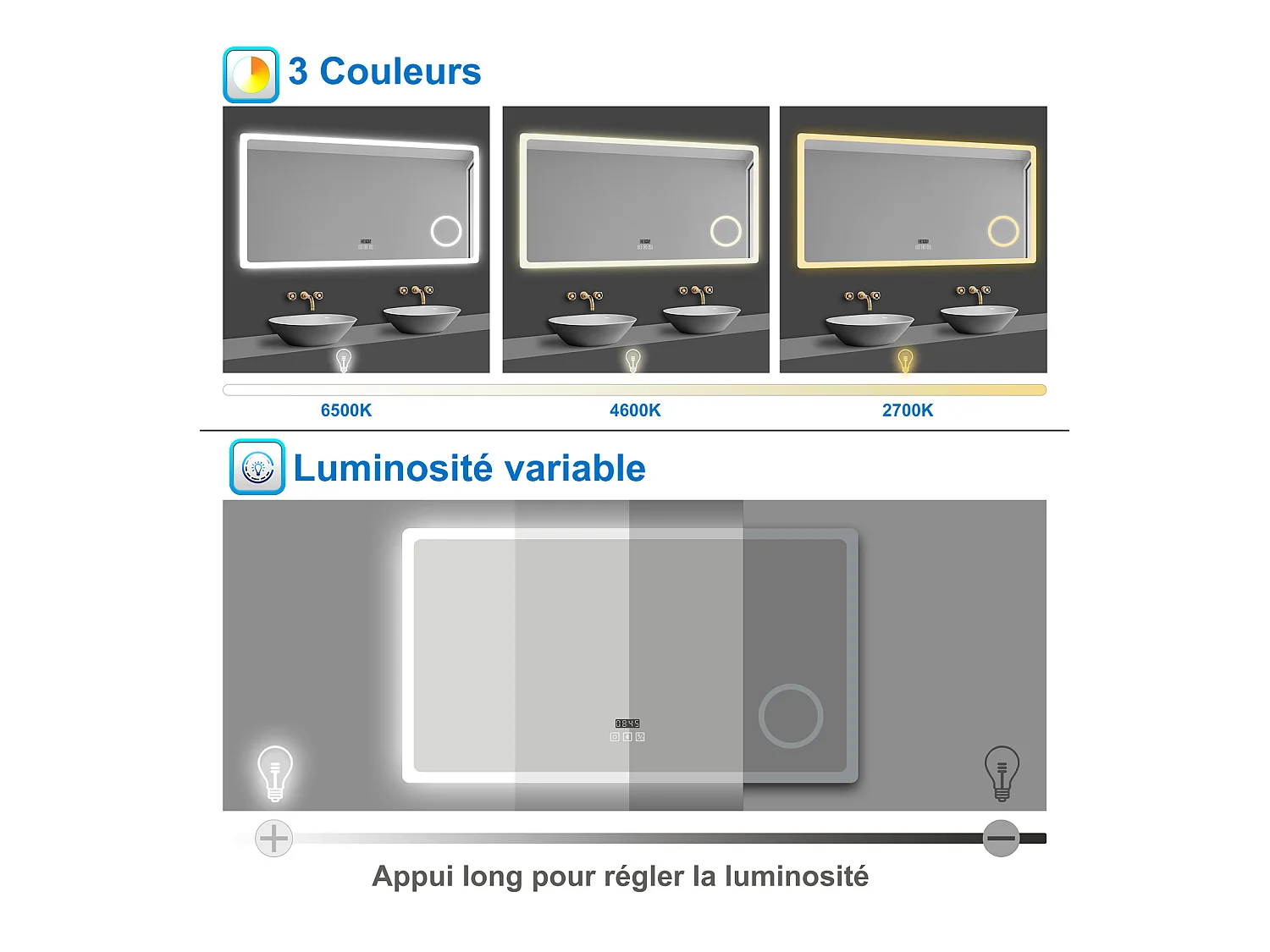 Aica Miroir Salle de Bain LED avec Bluetooth, Mural Miroir avec Horloge + 3 Couleurs + Dimmable + Anti-buée + Grossissant 3x -120 x 70cm
