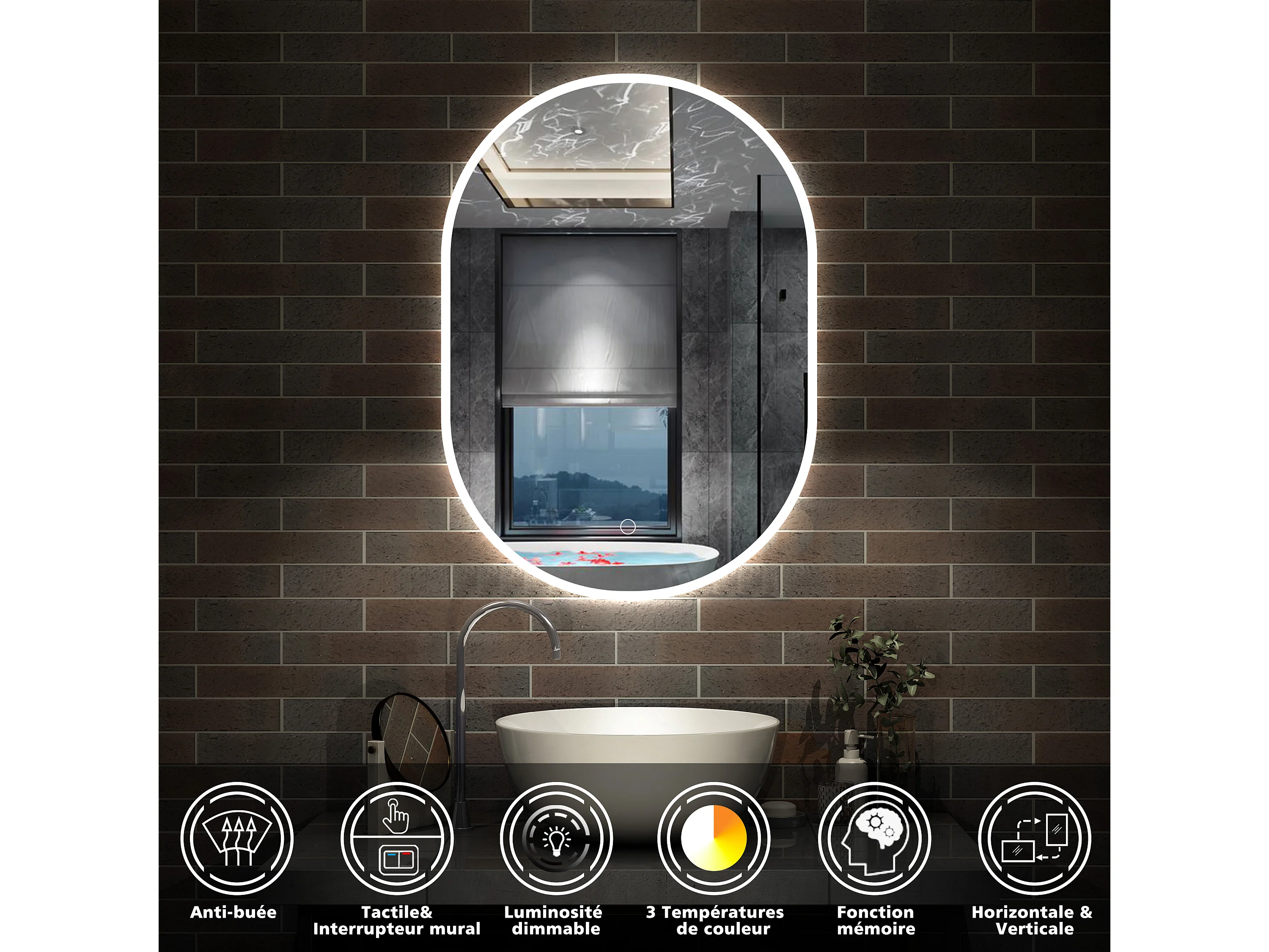 Miroir lumineux ovale l.50 x H.70cm avec Anti-buée + 3 Couleurs + Dimmable, Mural Miroir salle de bain