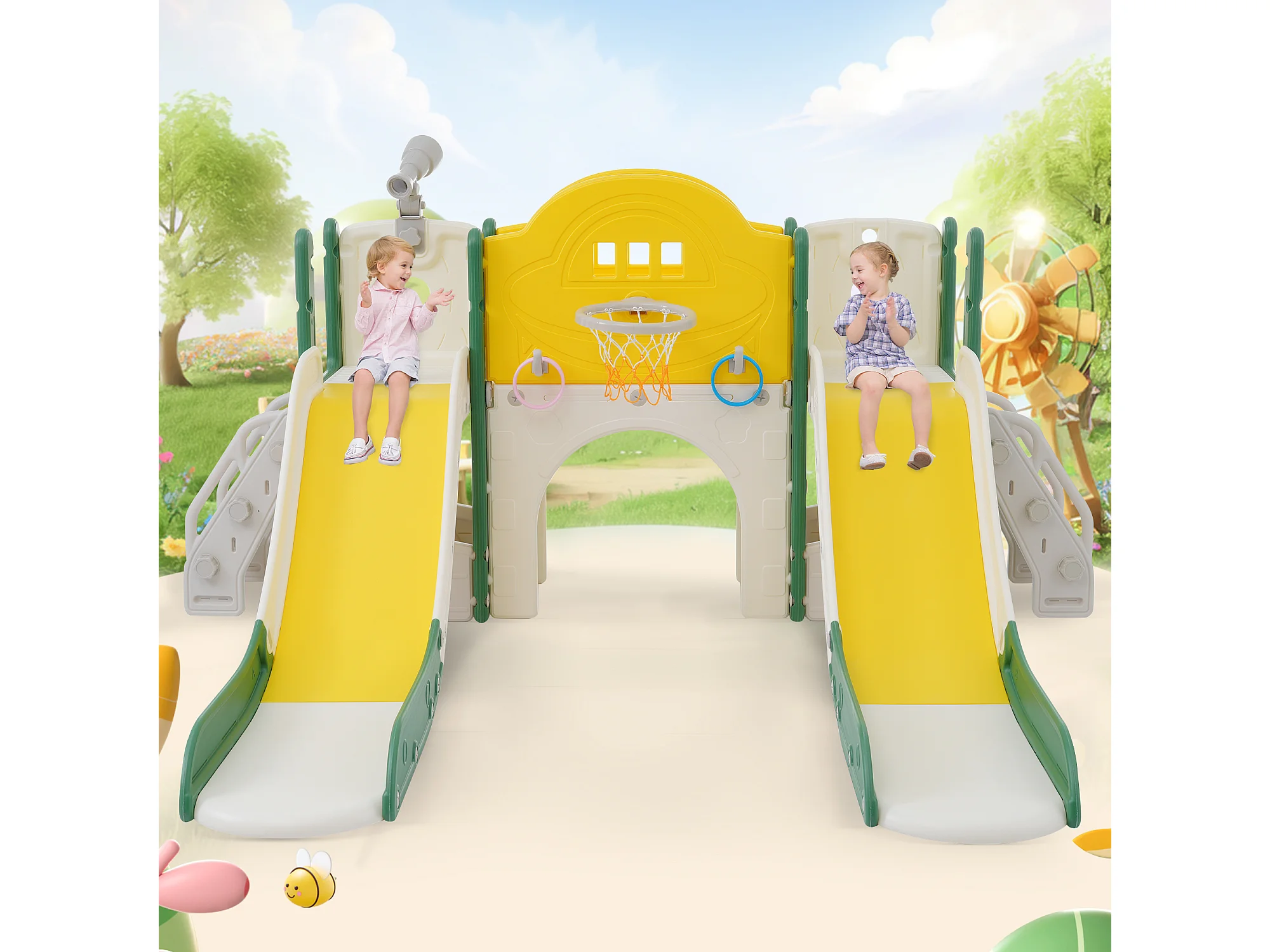Aire de jeux pour enfants 8 en 1 avec toboggan, mur d'escalade, jeu de trous de forage, vert