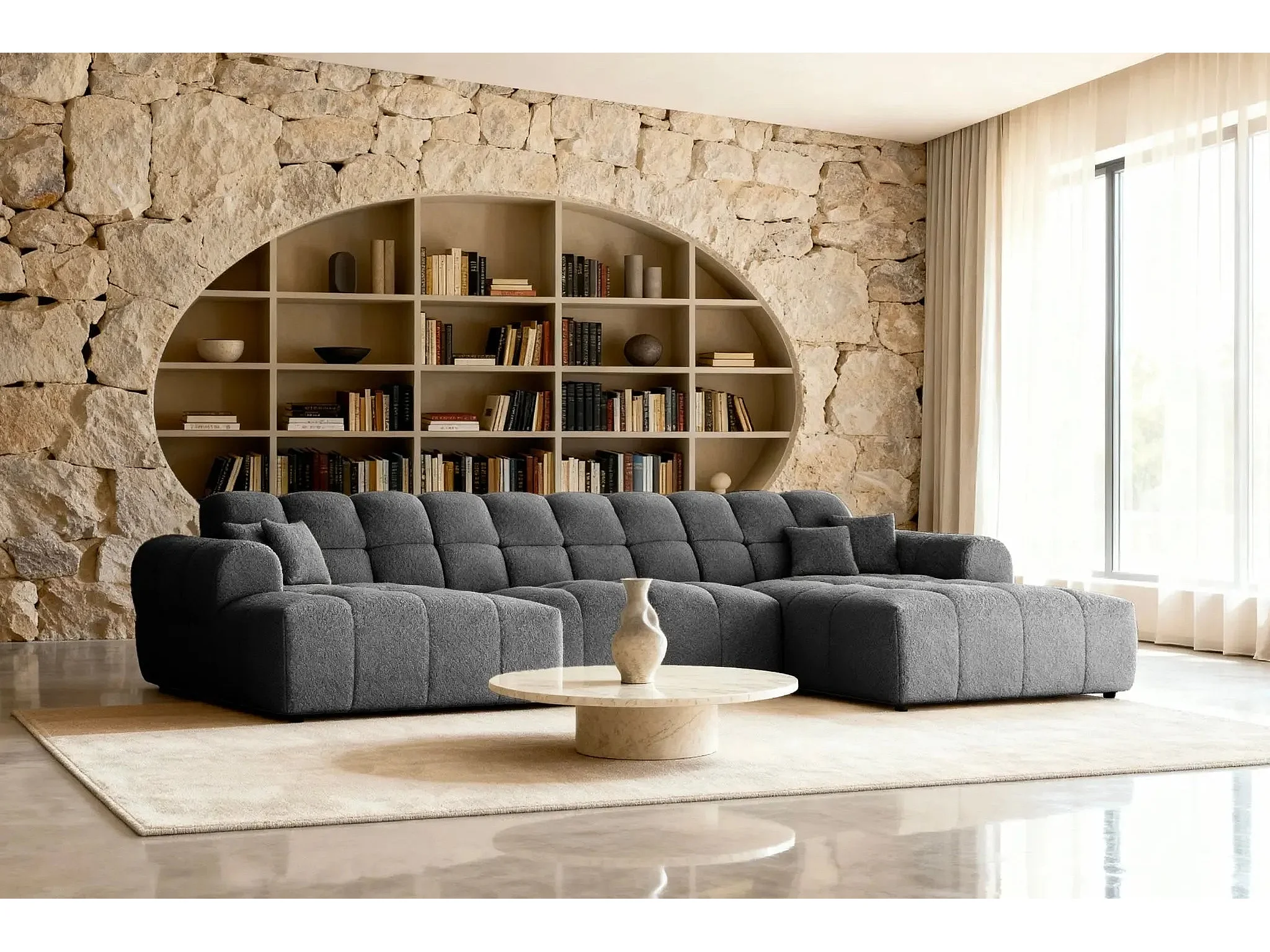 ALEXIA - Canapé panoramique tissu bouclette 5 places - Gris foncé