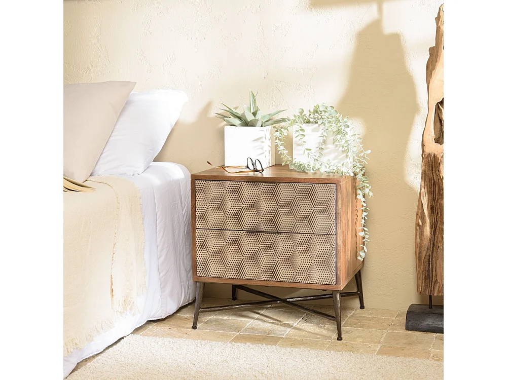 ALIX - Table de chevet en bois de manguier 2 tiroirs motifs ethniques