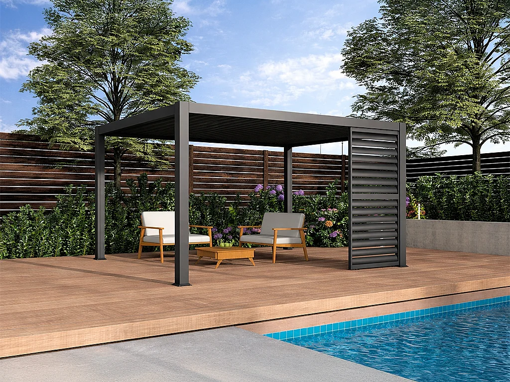 Pergola bioclimatique autoportante en aluminium 12m² avec claustra brise soleil L100 cm - Anthracite - ALMAFI