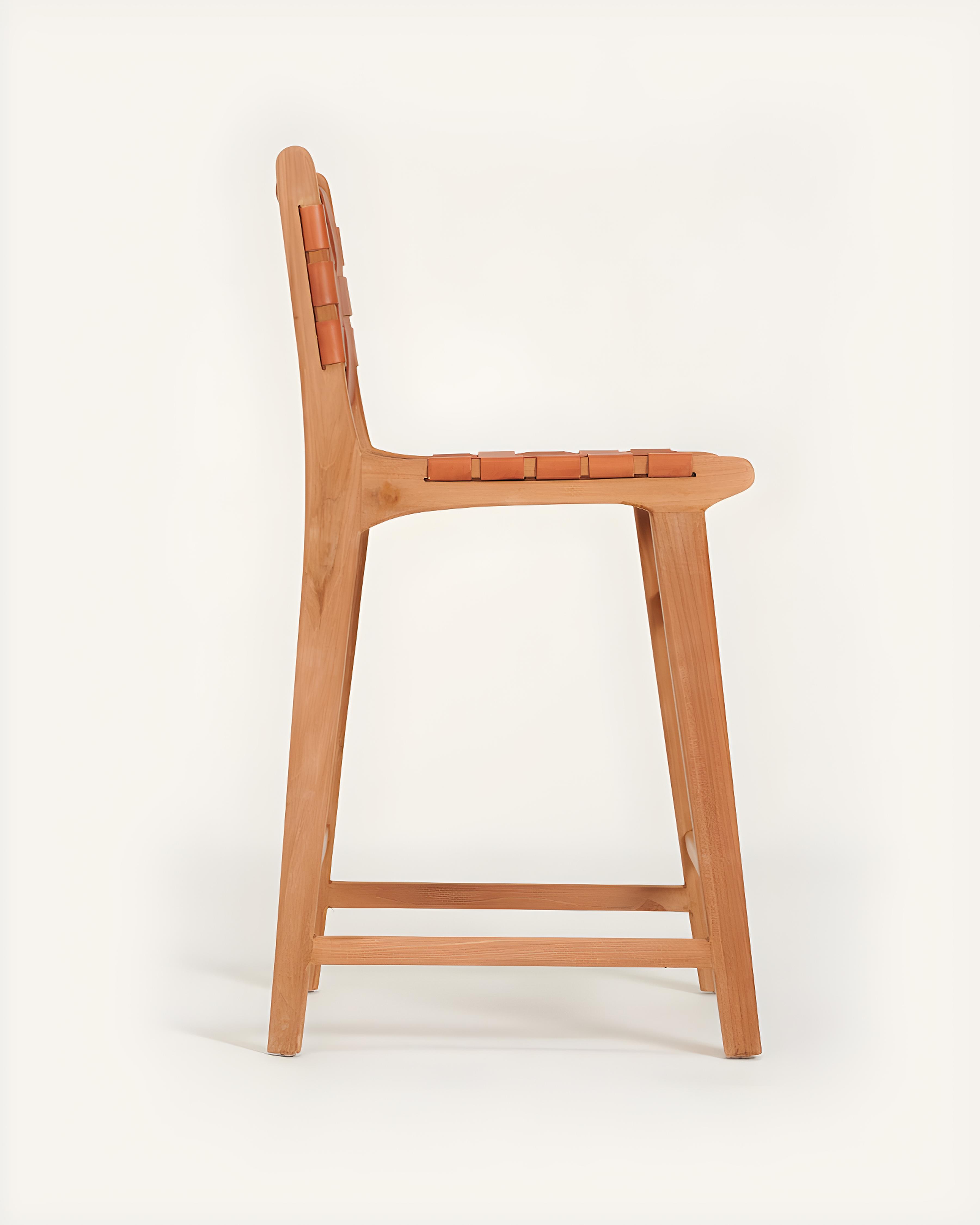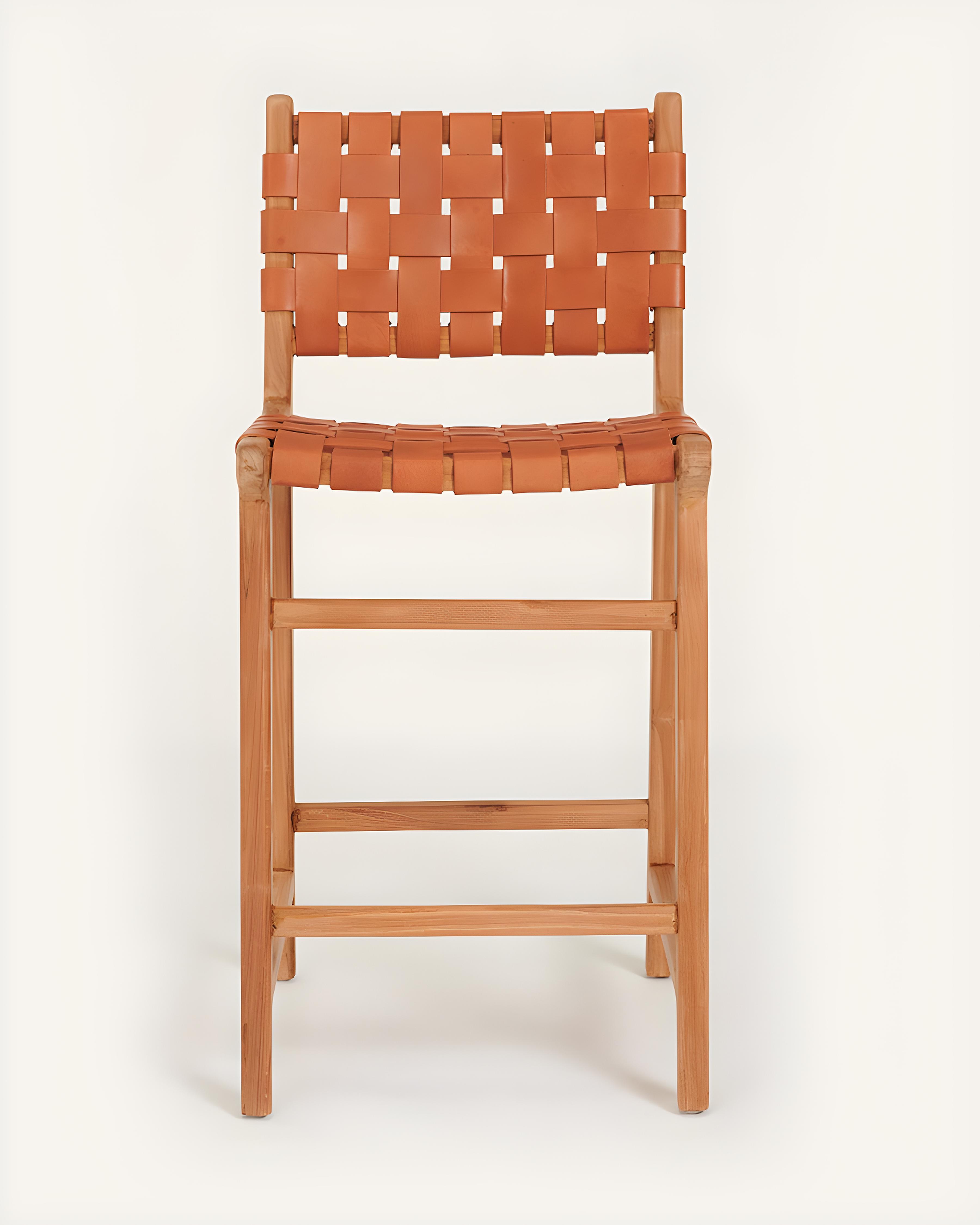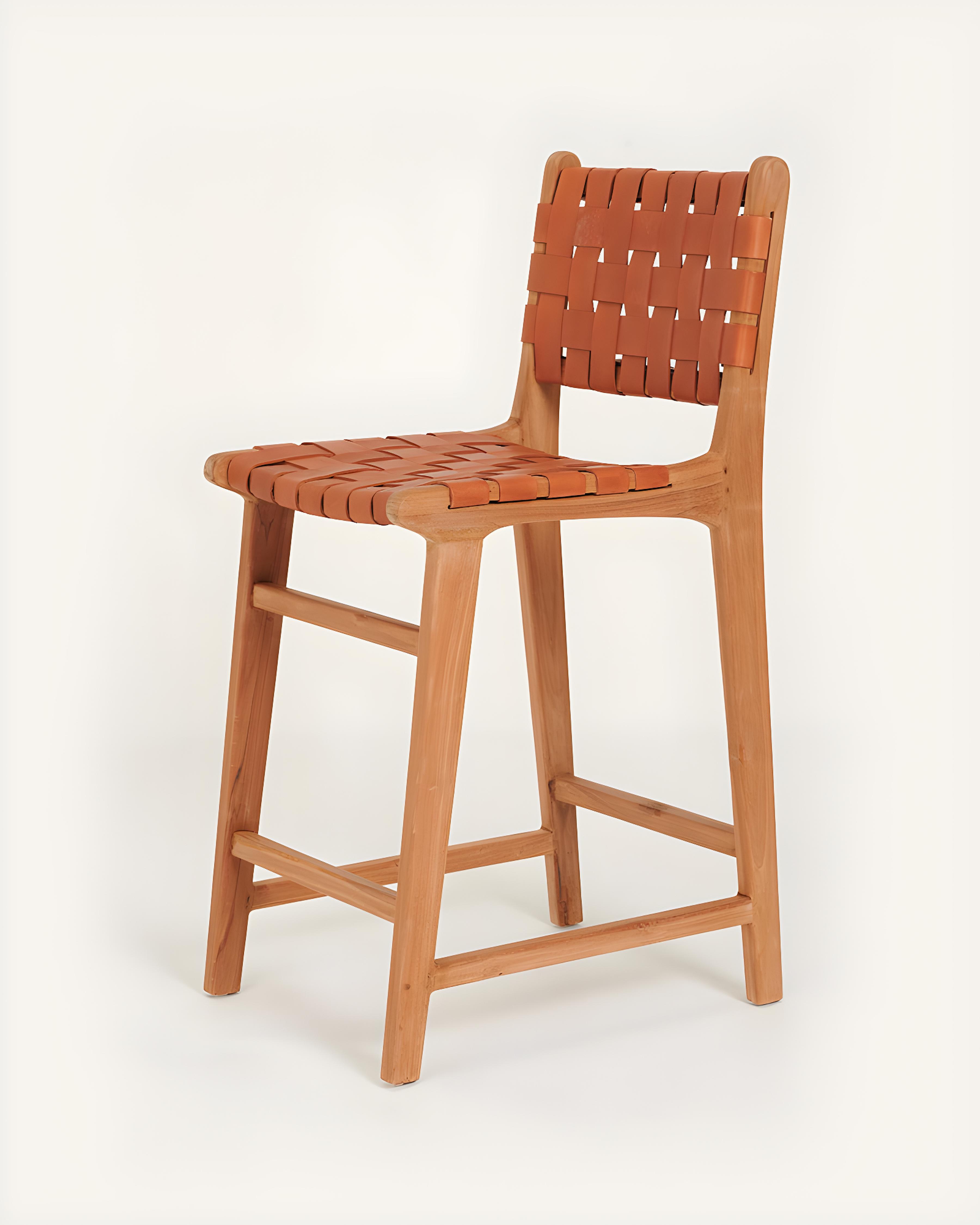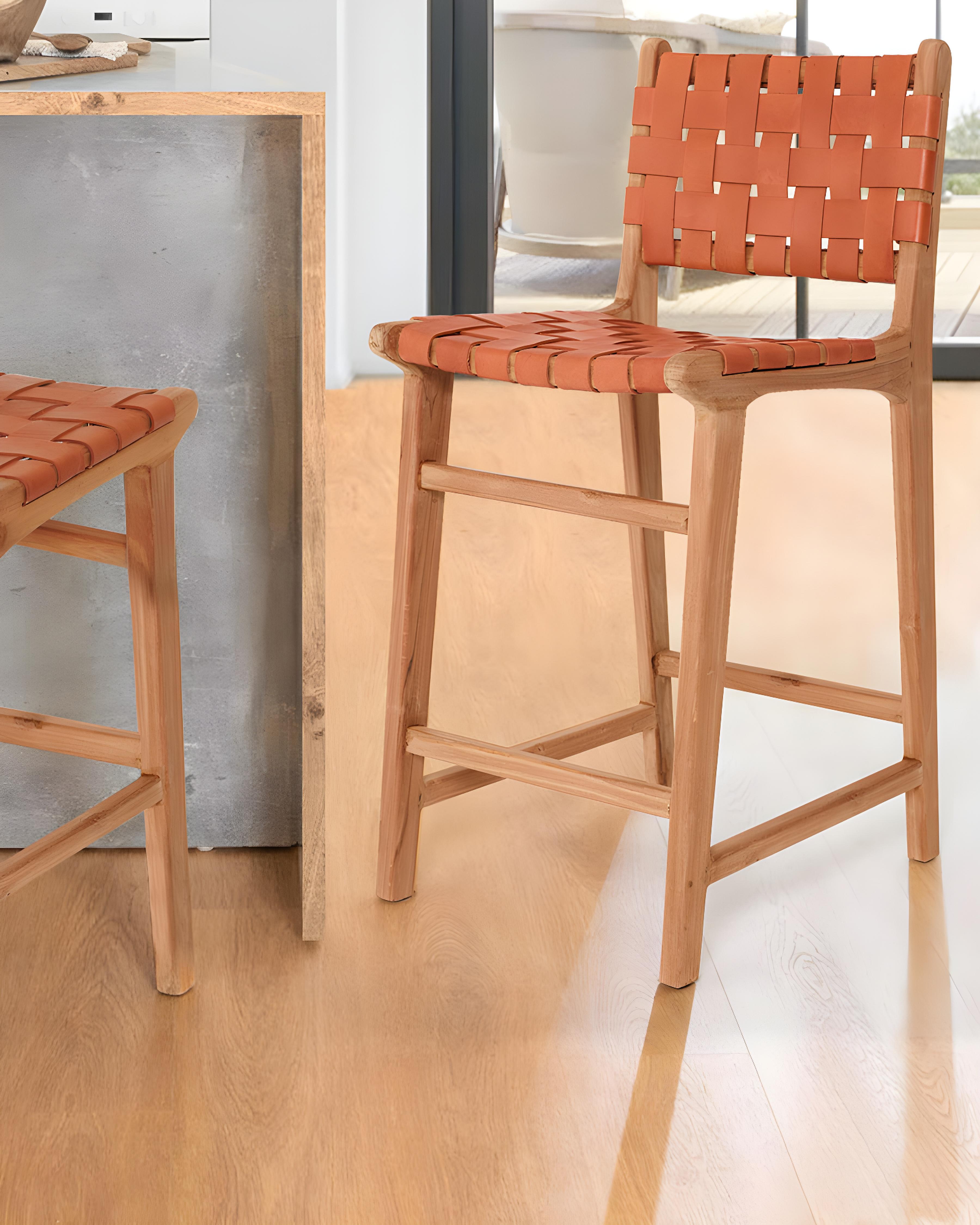 Ambra - Lot de 2 Chaise de bar en teck massif et cuir vachette tressé marron
