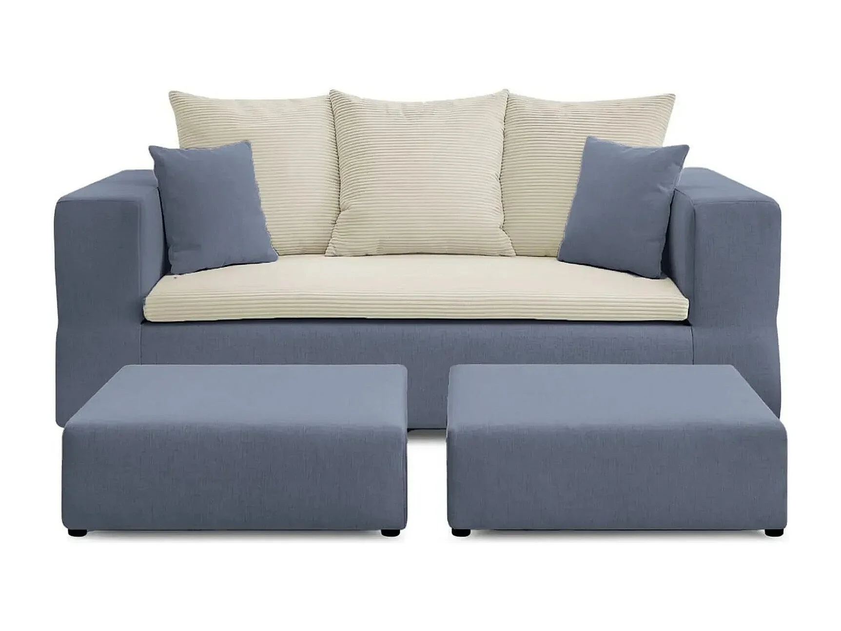 AMBRE - Canapé droit convertible bi matière avec deux poufs 4 places - Bleu