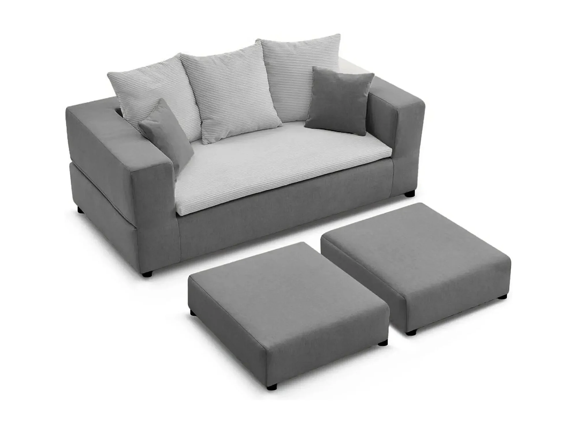 AMBRE - Canapé droit convertible bi matière avec deux poufs 4 places - Gris