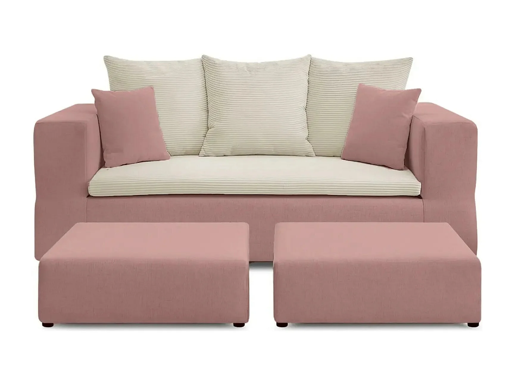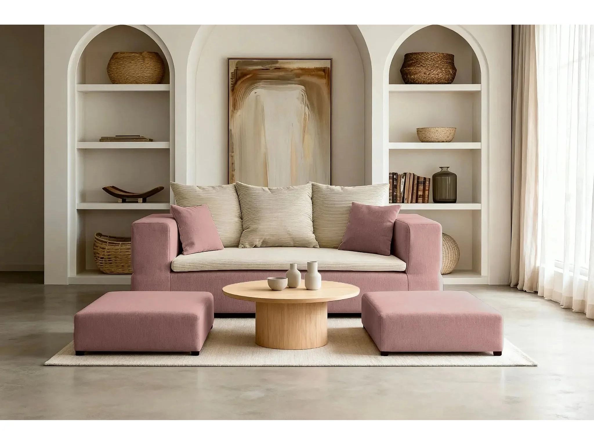 AMBRE - Canapé droit convertible bi matière avec deux poufs 4 places - Rose