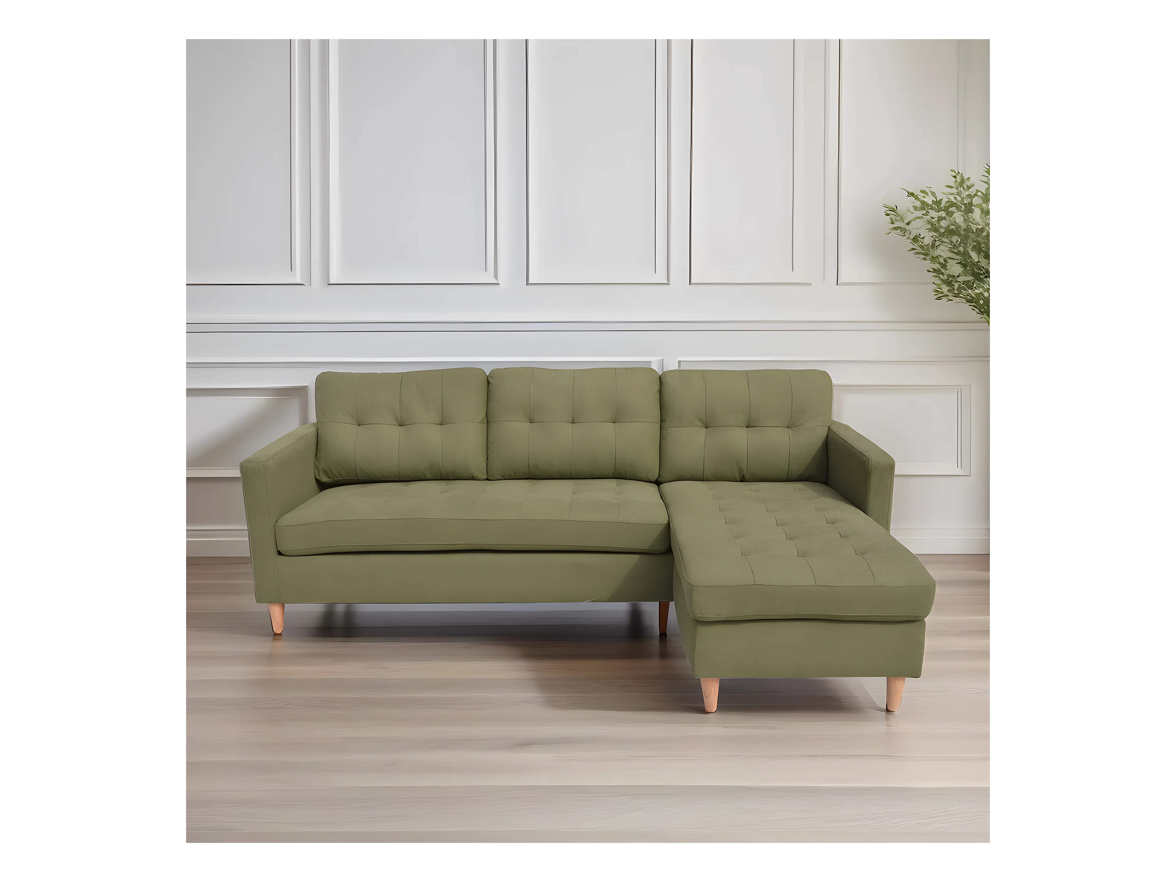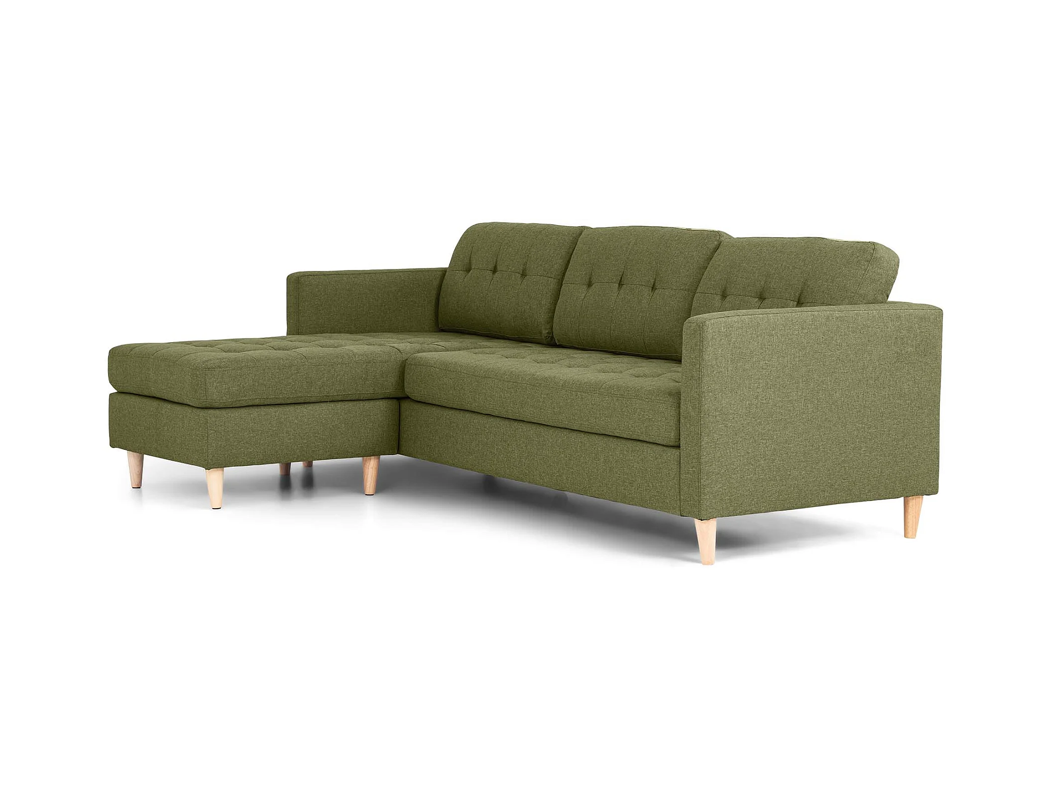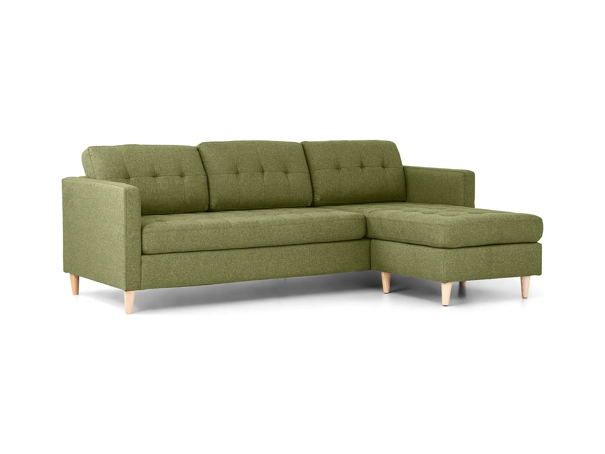 Mars Sofa, Canapé avec chaise longue réversible à droite ou à gauche, en tissu vert avec pieds en bois.