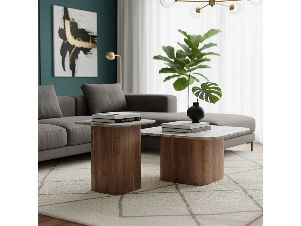 ANGELE - Lot de 2 Tables Basses Plateau Marbre Naturel Piètement Acacia