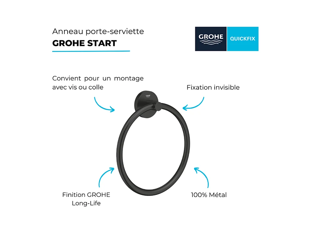 Anneau porte serviettes GROHE Start noir mat + colle GROHE QuickGlue