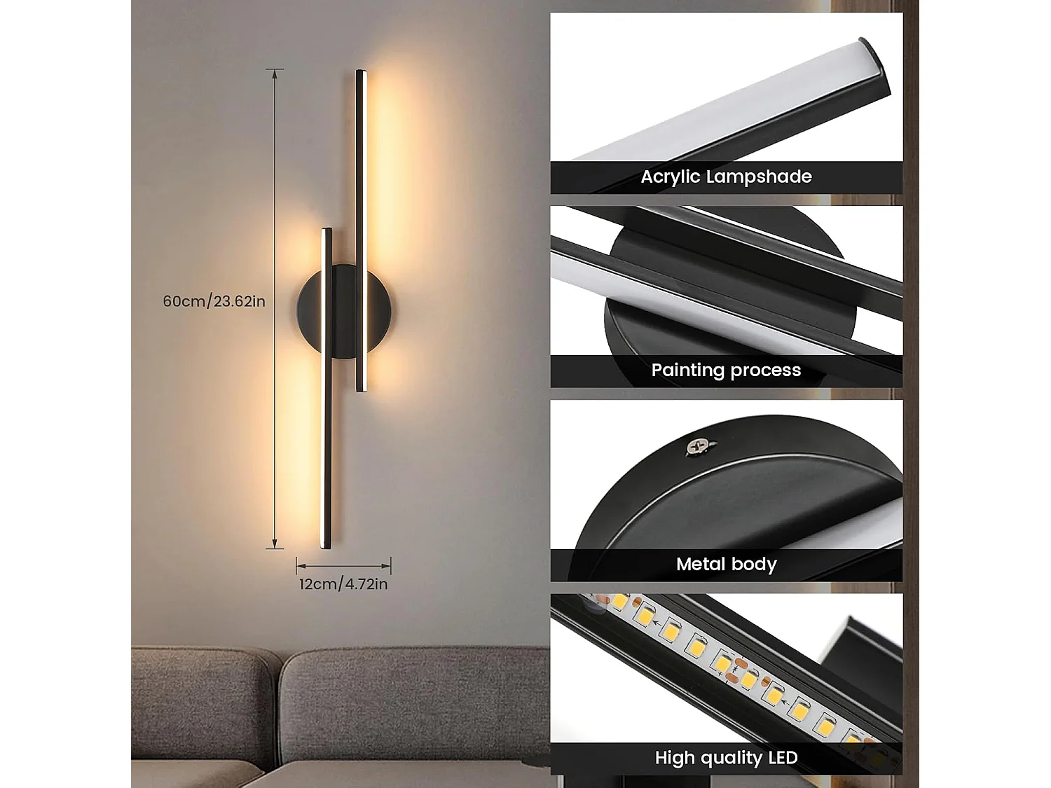 Applique murale LED d'intérieur, 24W, moderne, noire, lumière chaude 3000K, matériau acrylique, idéale pour la chambre, le couloir ou le salon
