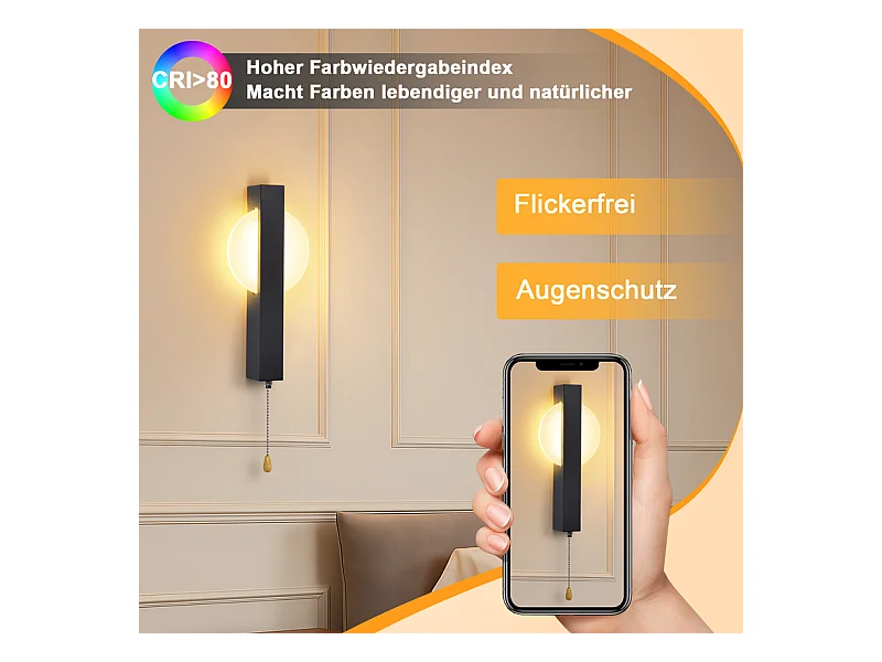 Applique murale LED Nettlife avec interrupteur - Lampe de couloir d'intérieur noire avec interrupteur à tirette, blanc chaud 3000 K, 6W