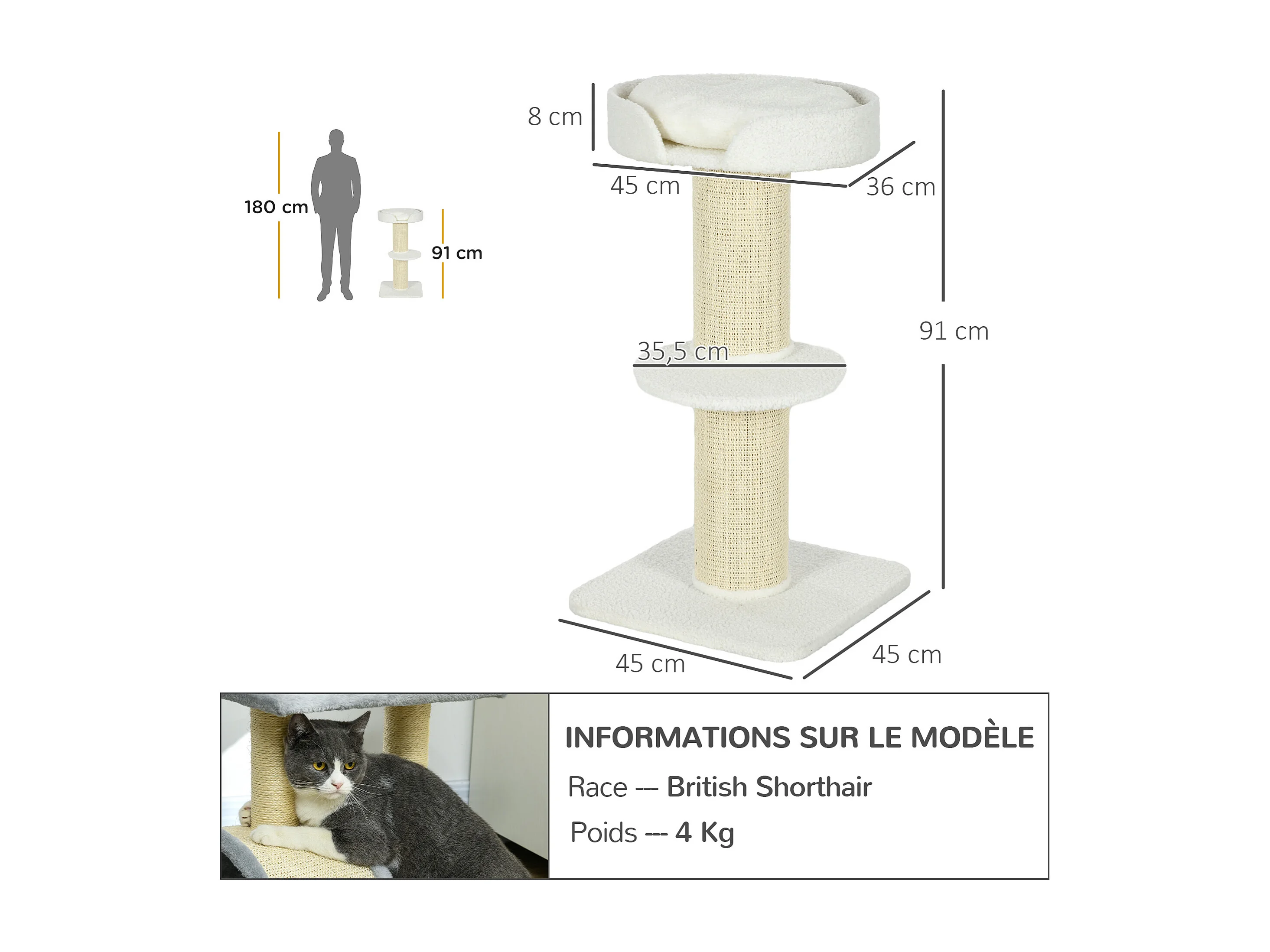 Arbre à chat griffoir grattoir design jeu boule suspendue 2 plateformes peluche sisal naturel crème