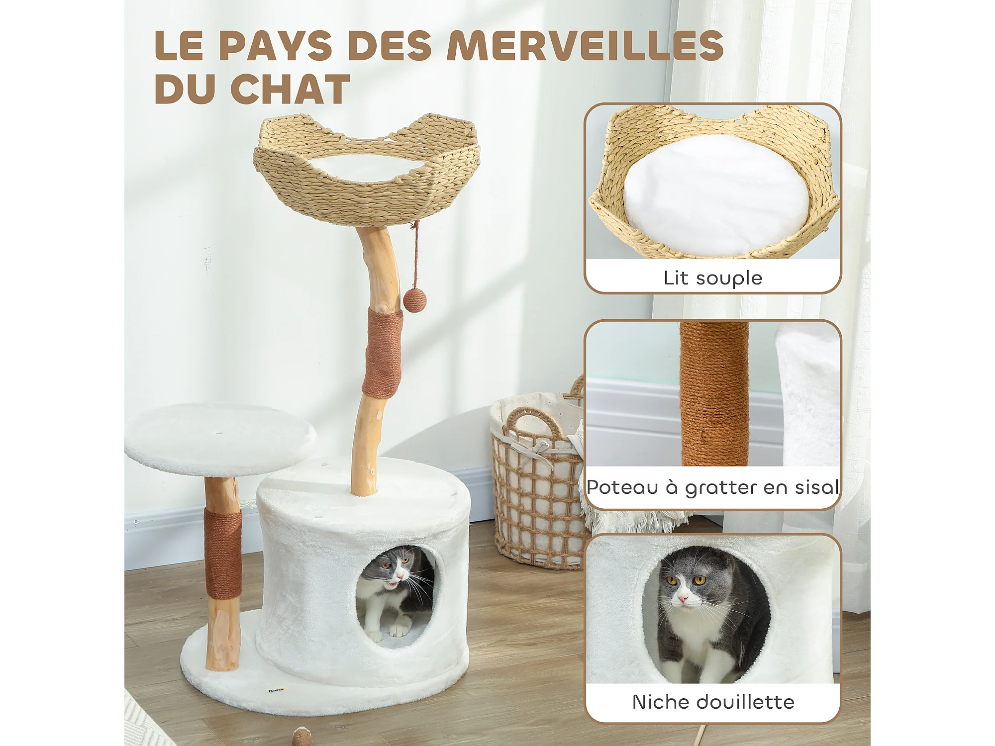 Arbre à chat bois design naturel griffoirs boule chanvre panier observation tressé coussin niche