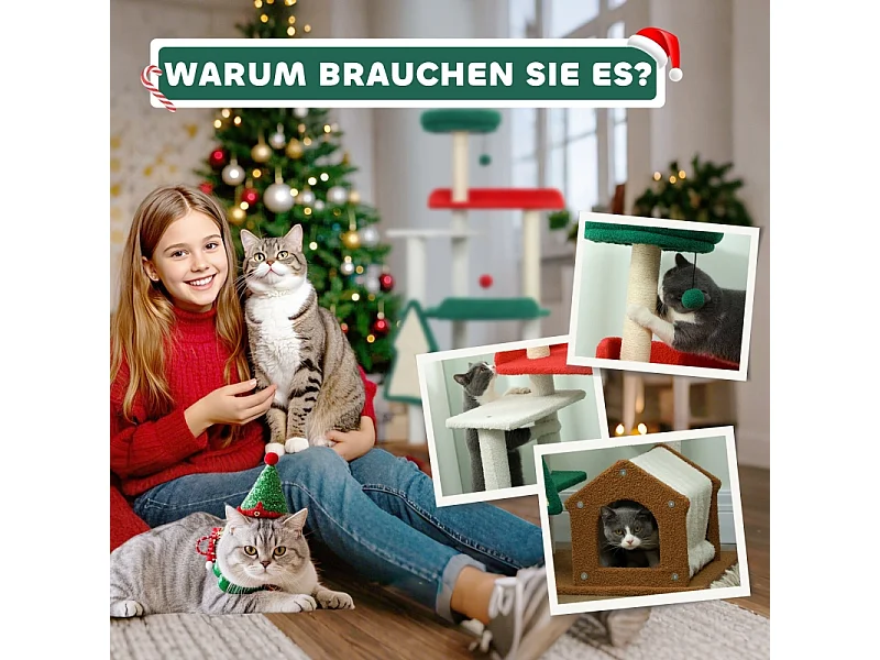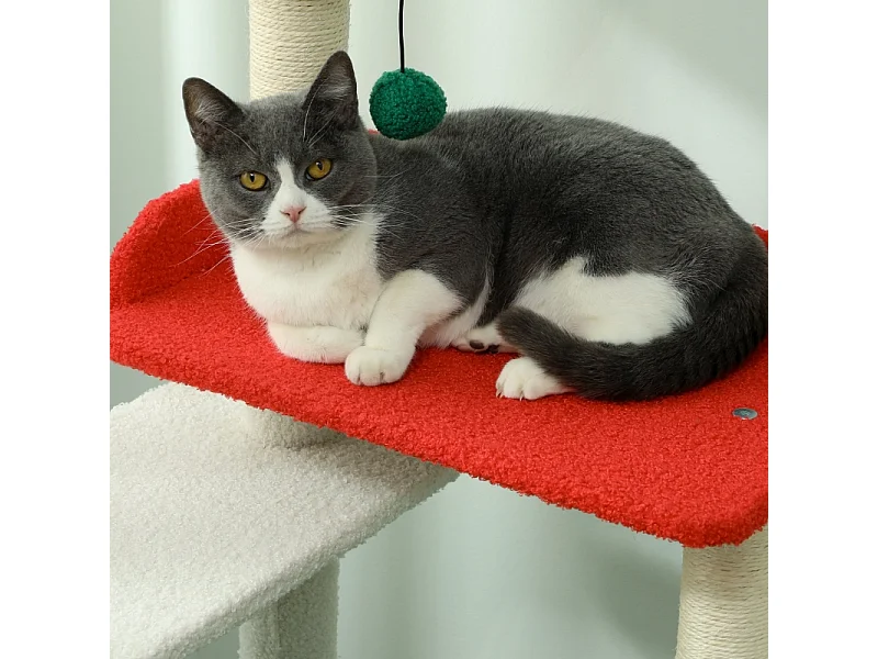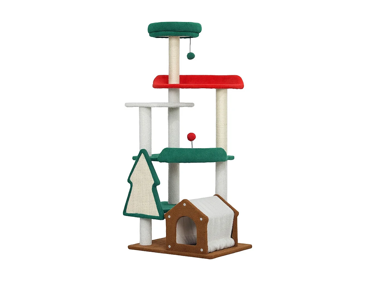 Arbre à chat de Noël, 6 niveaux, bois et tissu, rouge/vert (60x45x135 cm)
