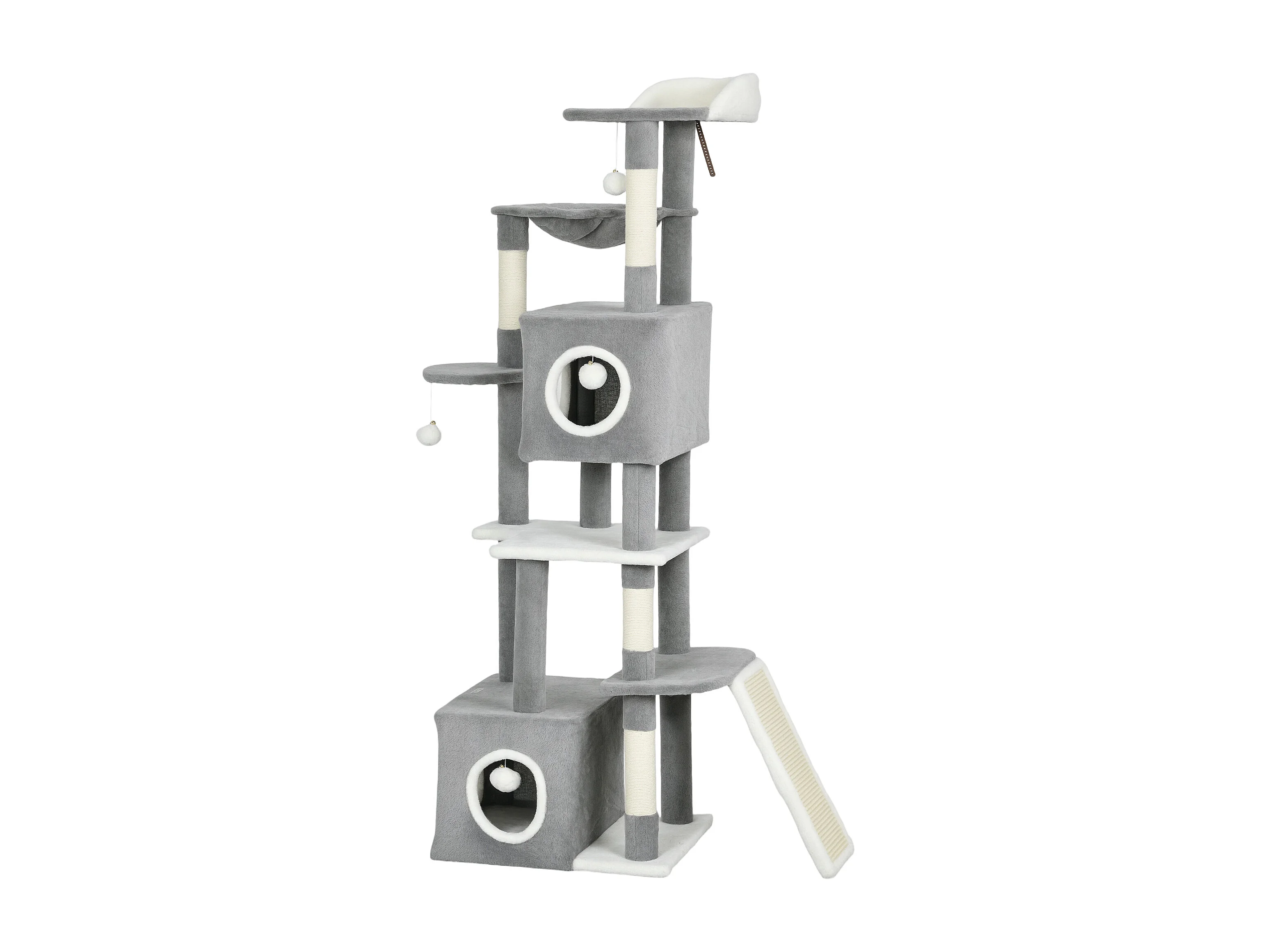 Arbre à chat multi-équipé niche hamac plateforme 3 boules griffoirs grattoir gris