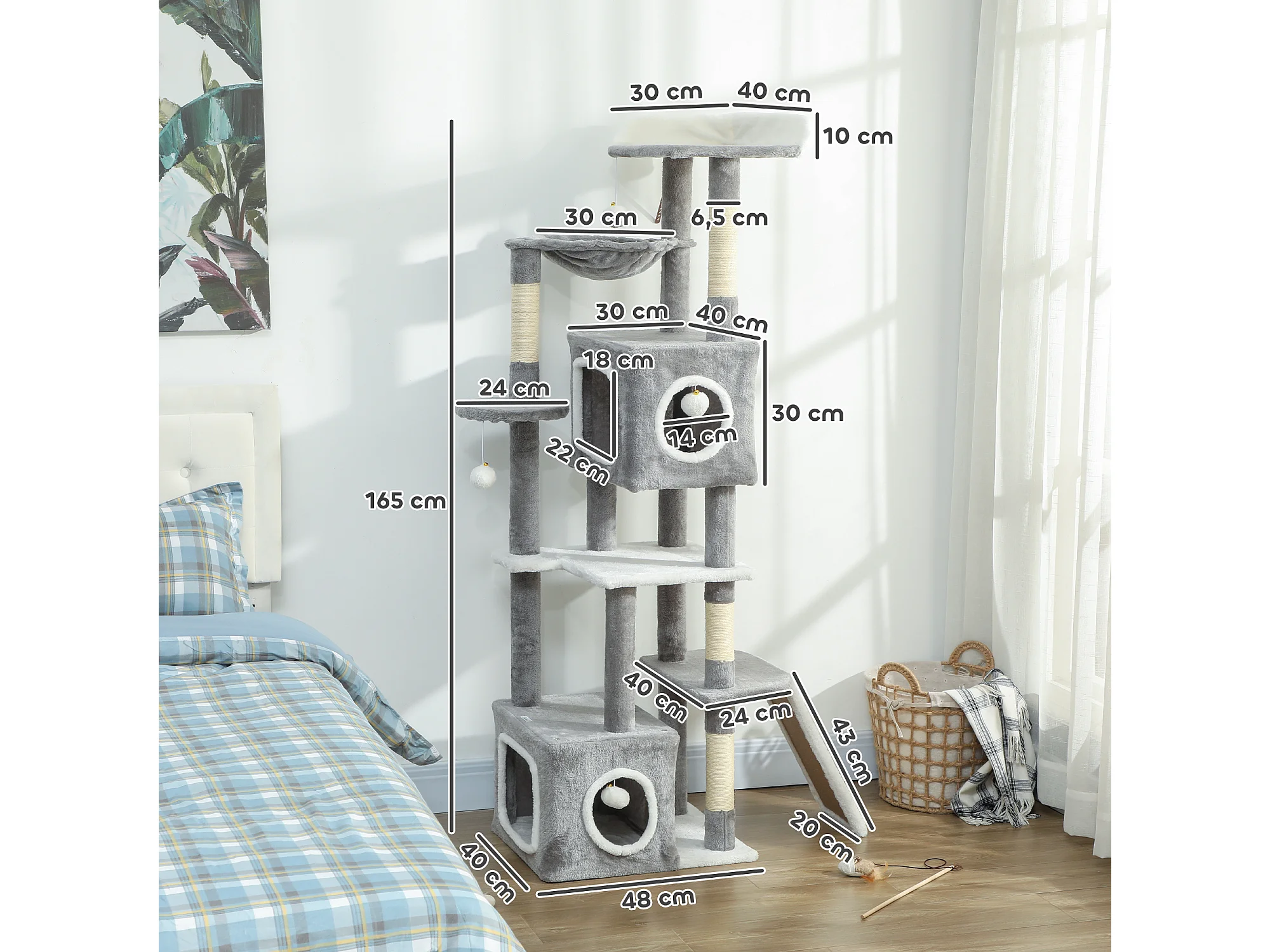 Arbre à chat design grande taille H.177cm équipements jeux multiples sisal naturel peluche gris clair