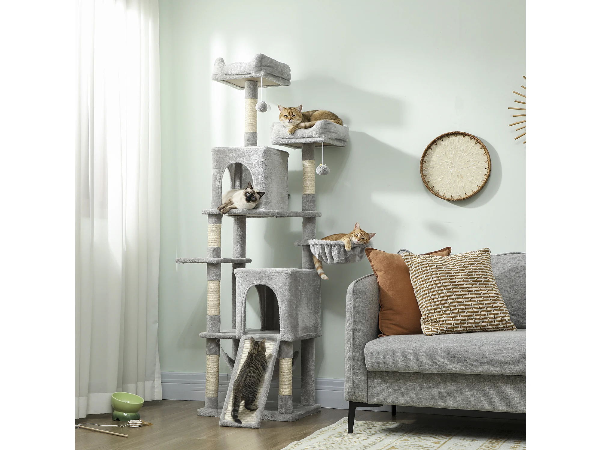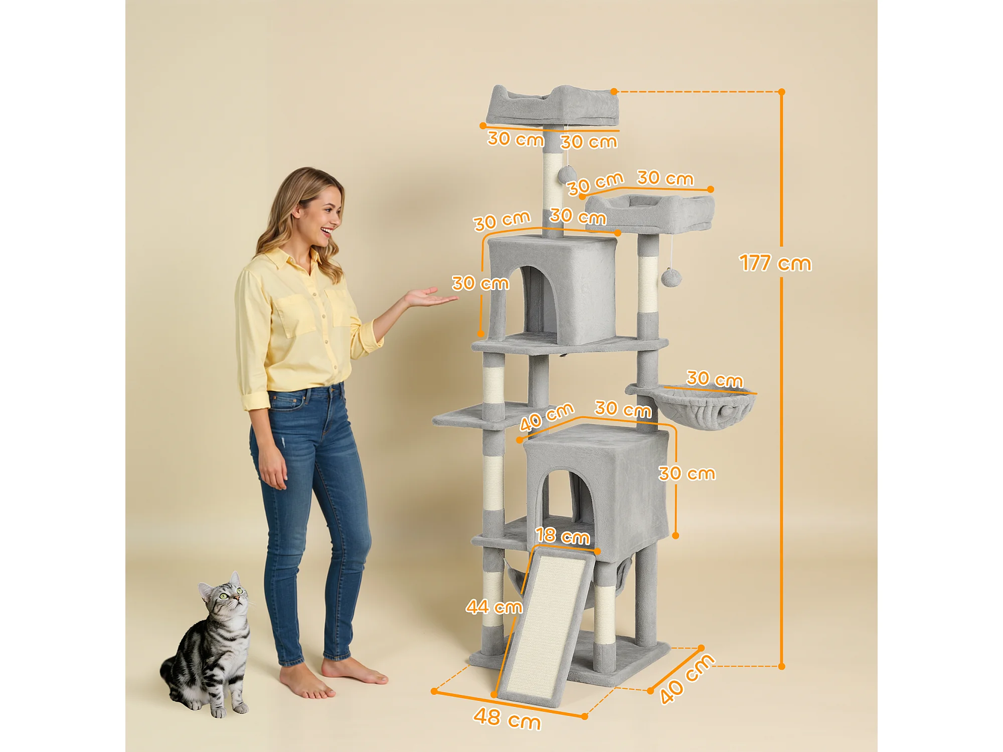 Arbre à chat design grande taille H.177cm équipements jeux multiples sisal naturel peluche gris clair