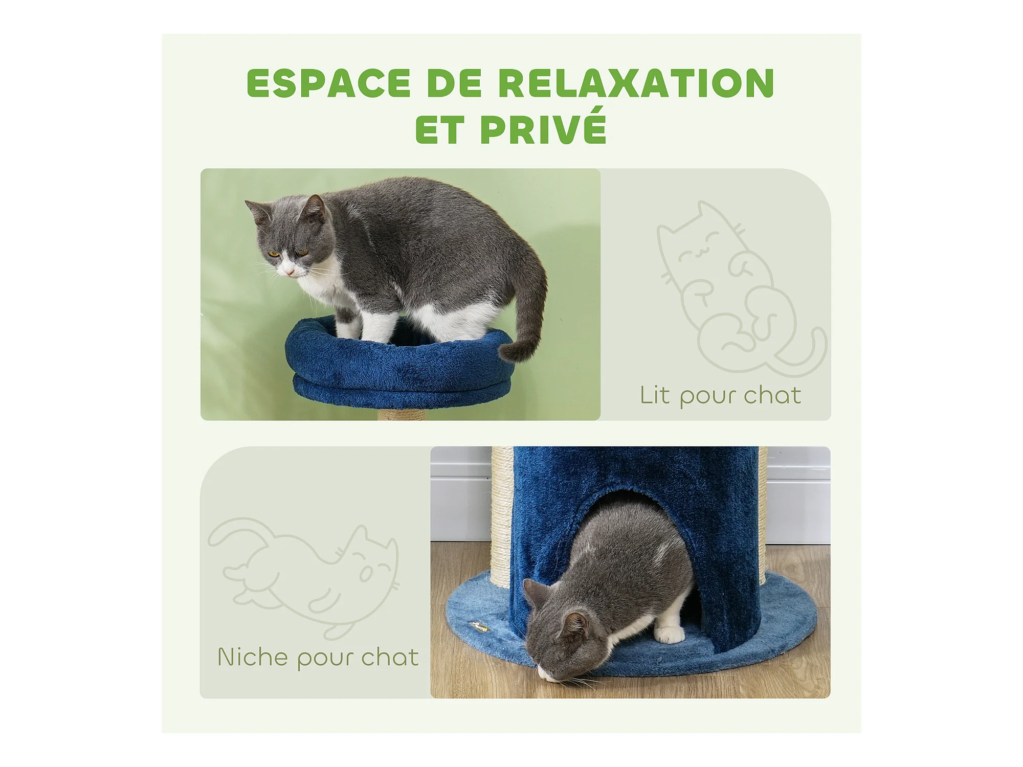 Arbre à chat design - niche, 2 plateformes, 2 coussins, griffoirs - peluche bleu roi