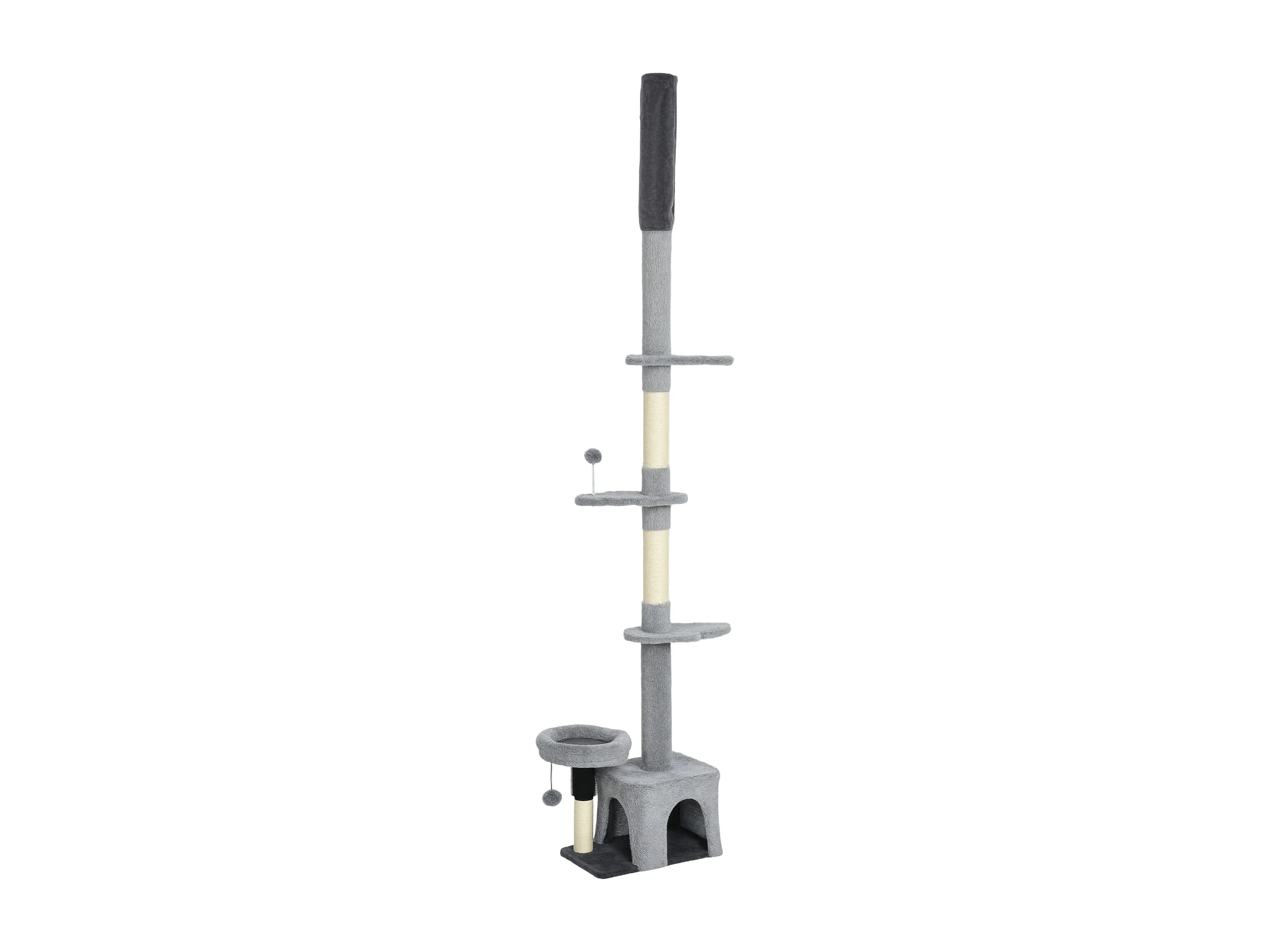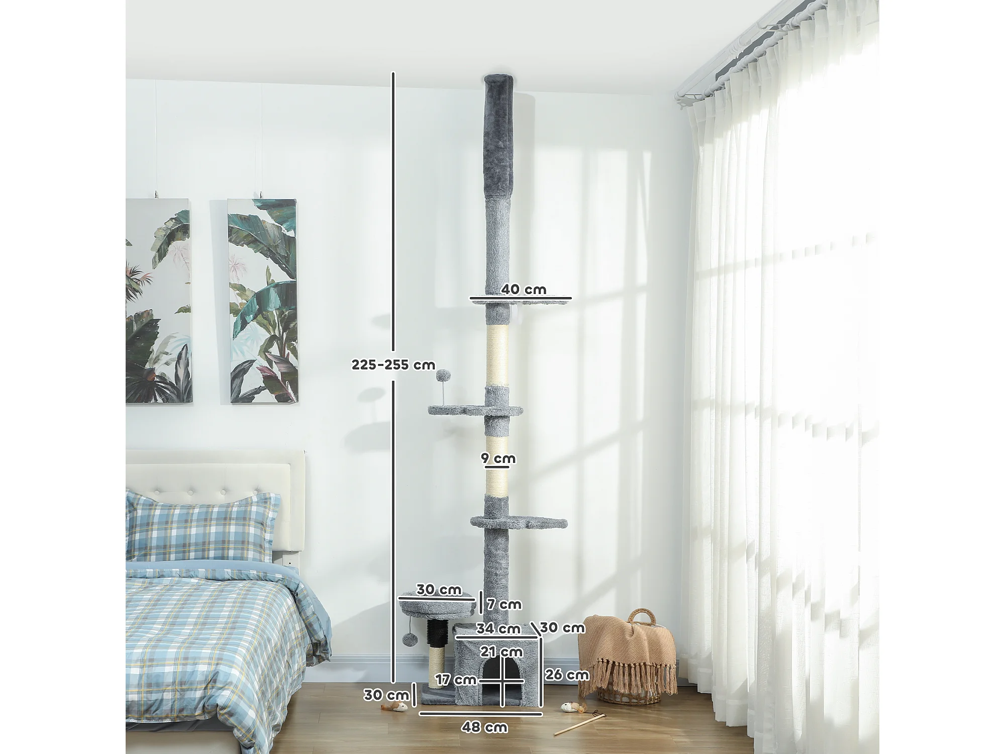 Arbre à chat du sol au plafond H.225-255cm - arbre à chat tour réglable - niche, plateformes, griffoirs, boules - gris