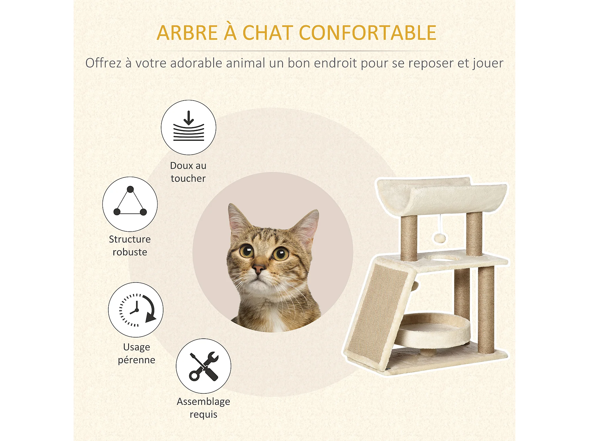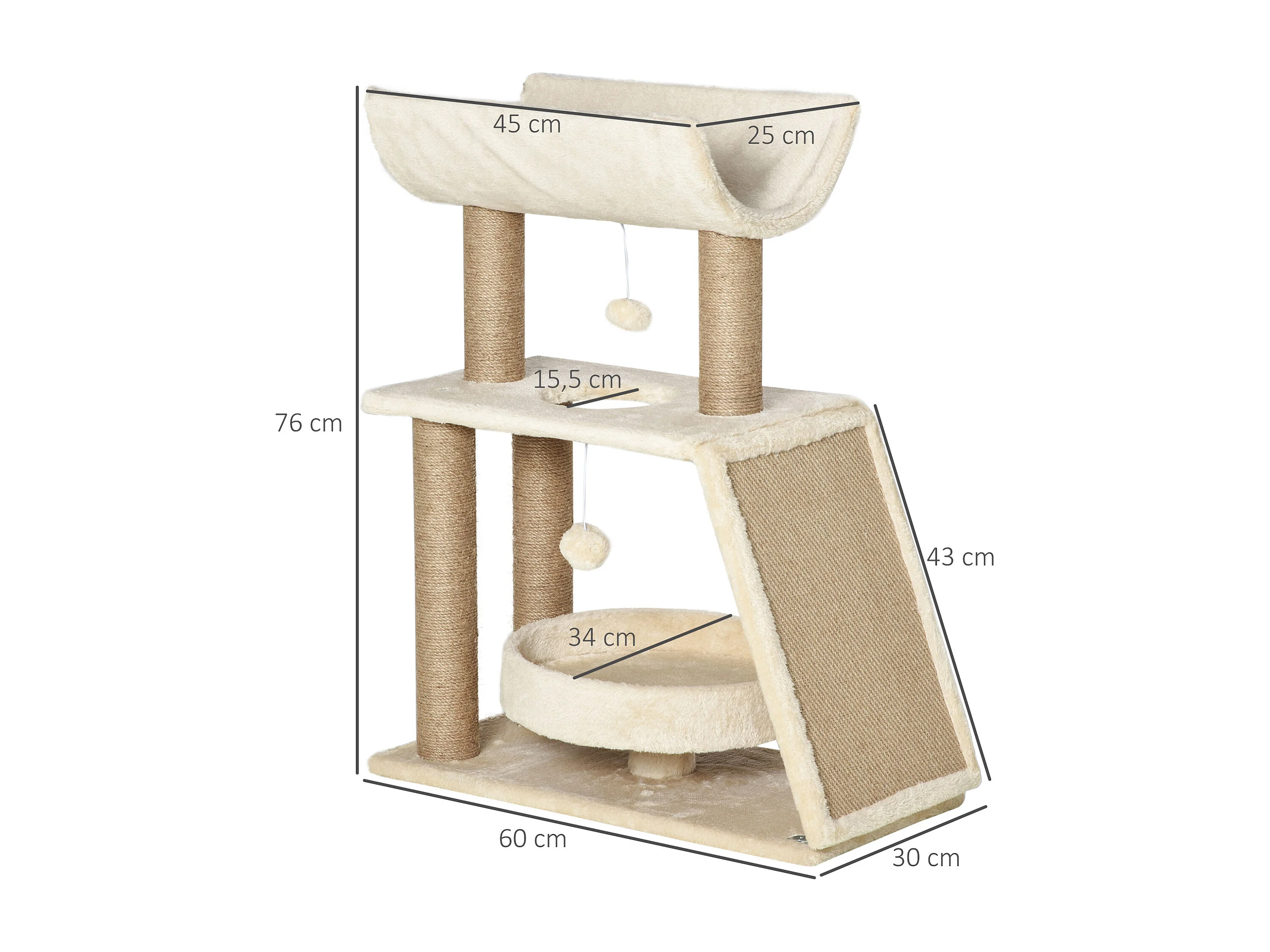 Arbre à chat griffoirs grattoir jeu boules suspendues plateformes ronde, rectangulaire et demi-cylindrique peluche jute naturelle beige
