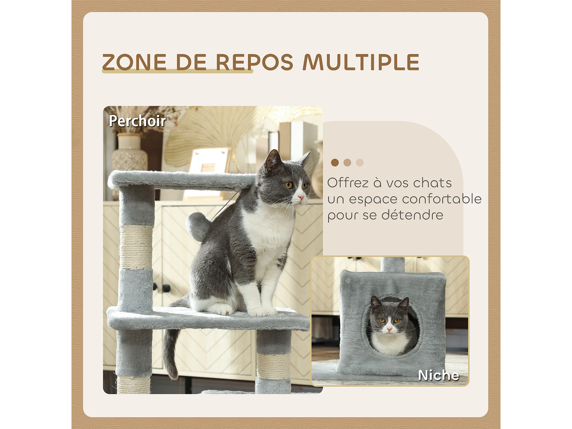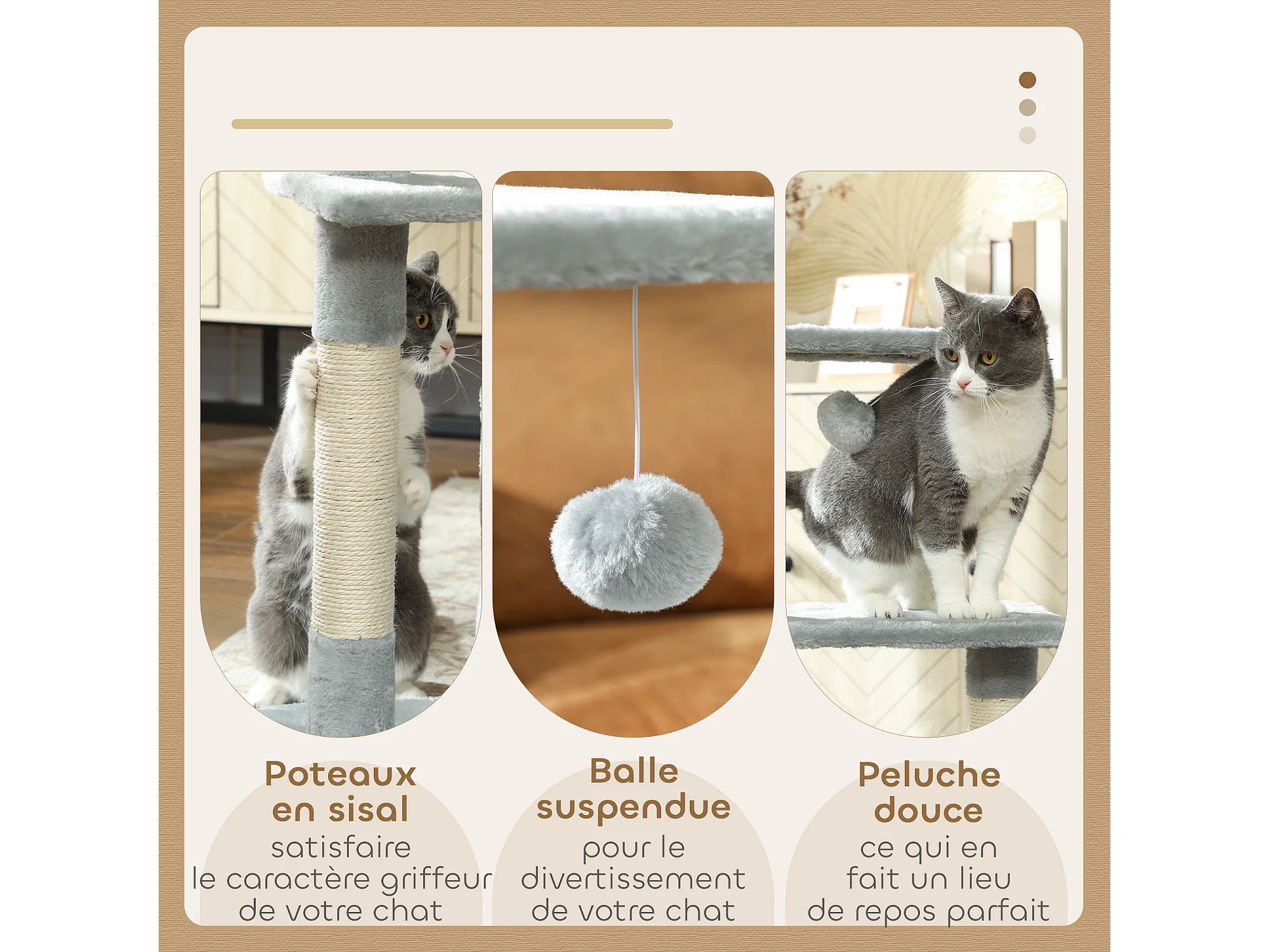 Arbre à chat H.81cm niche 3 griffoirs 2 plateformes jeu boule suspendue gris