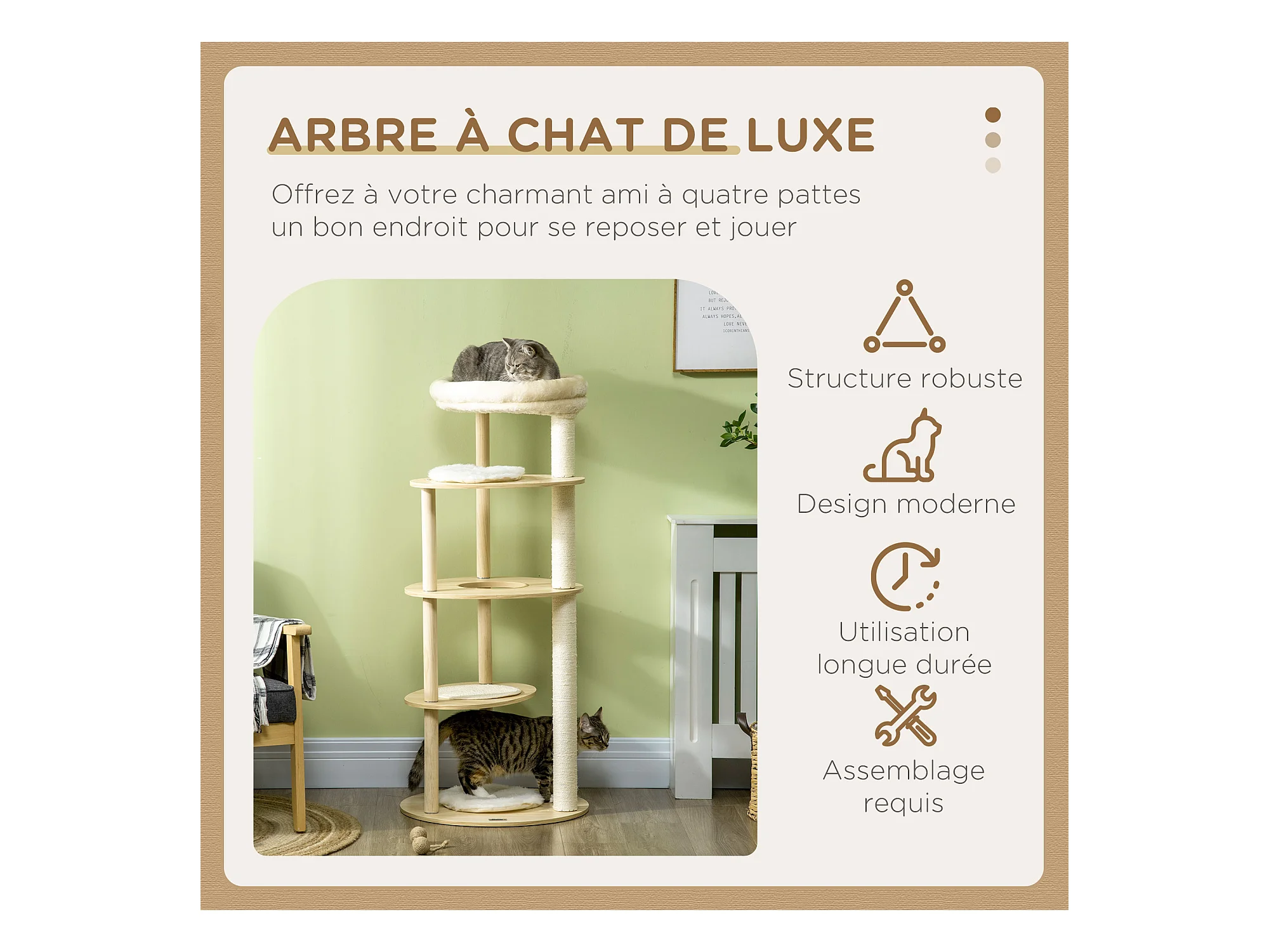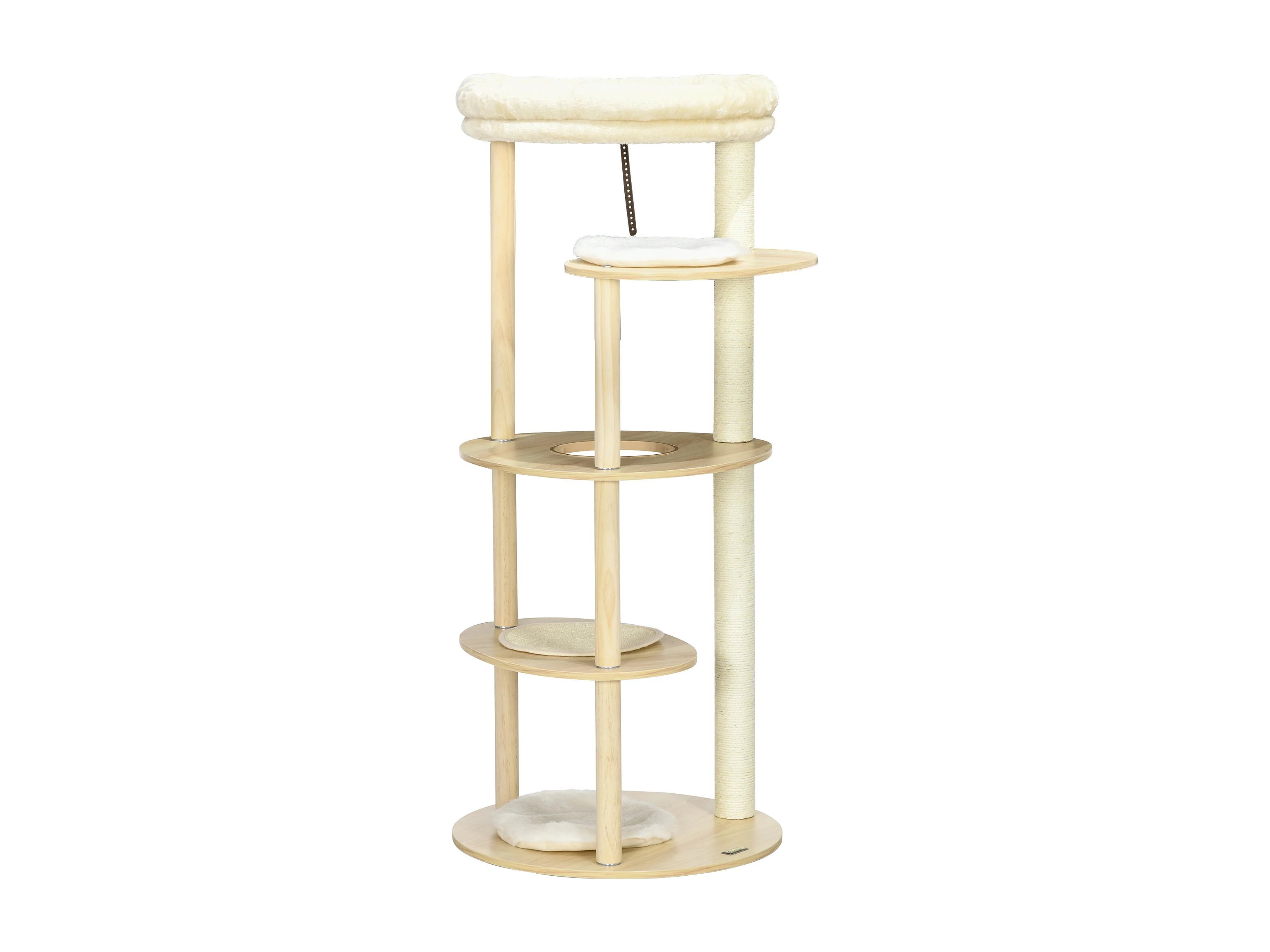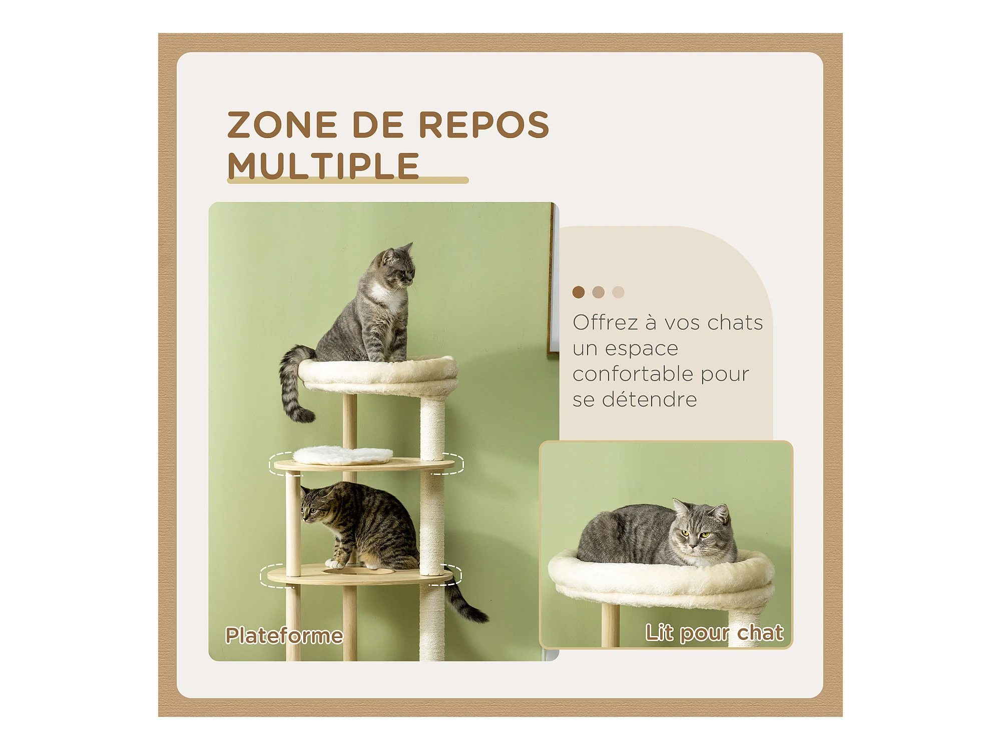Arbre à chat style nordique griffoir sisal naturel 4 plateformes coussins panier d'observation amovible bois pin panneaux bois clair