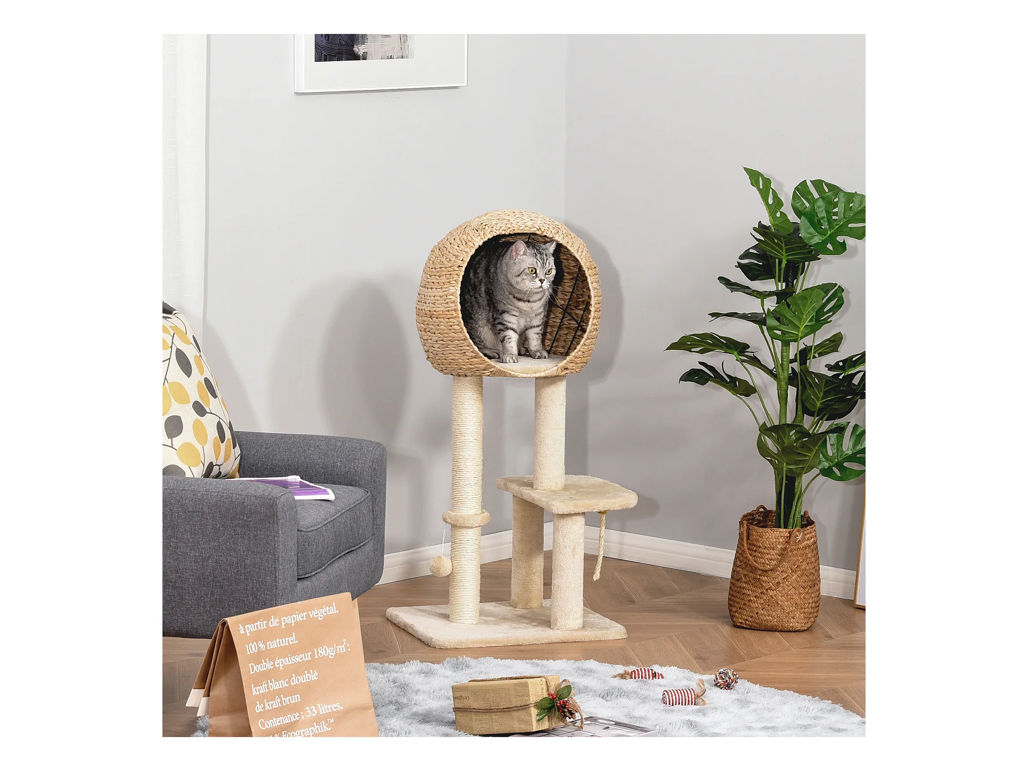 Arbre à chats style cosy chic griffoir sisal naturel grande niche plateformes jeu boule corde escalade peluche courte massette beige
