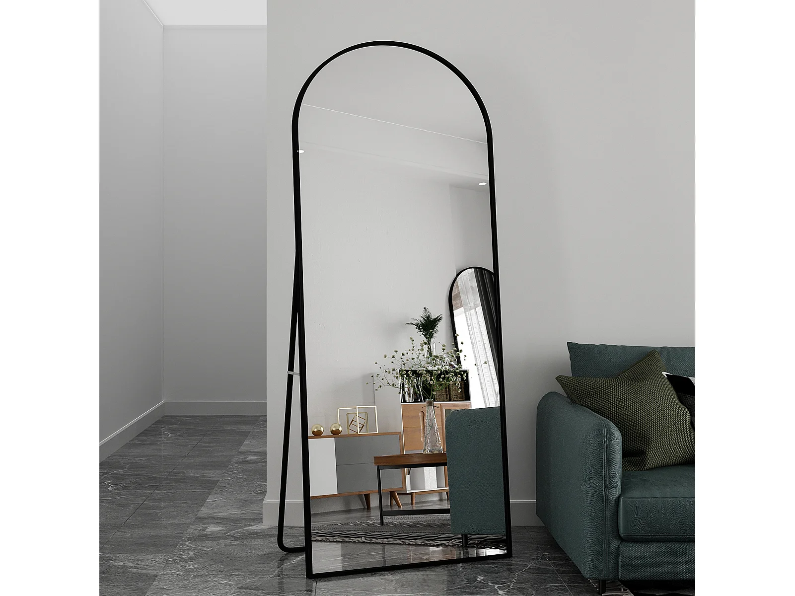 Miroir sur pied arqué 180x80cm, avec support réglable, cadre en aluminium noir, à poser ou à incliner, pour salon
