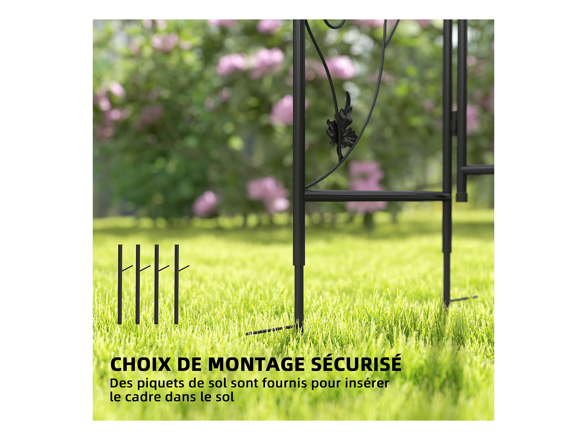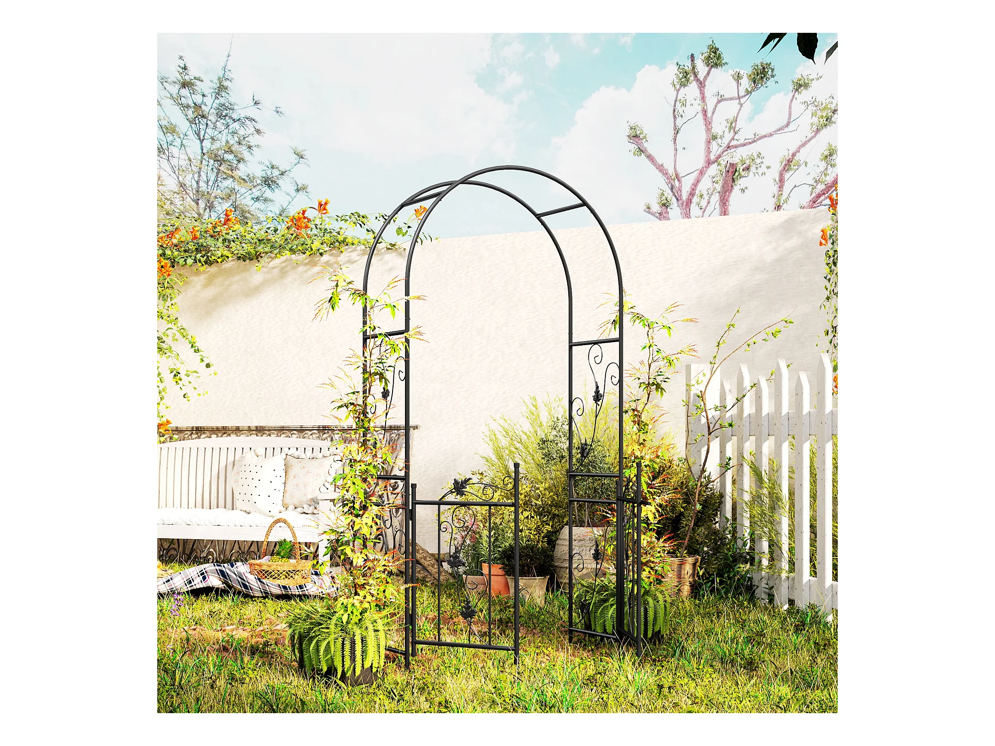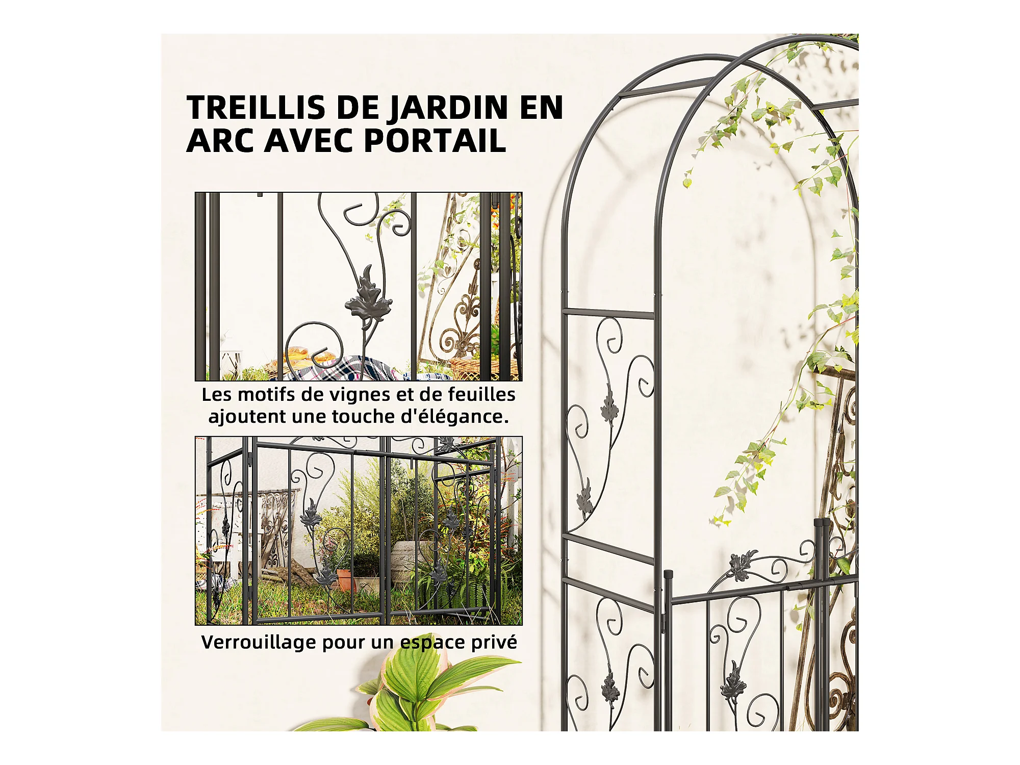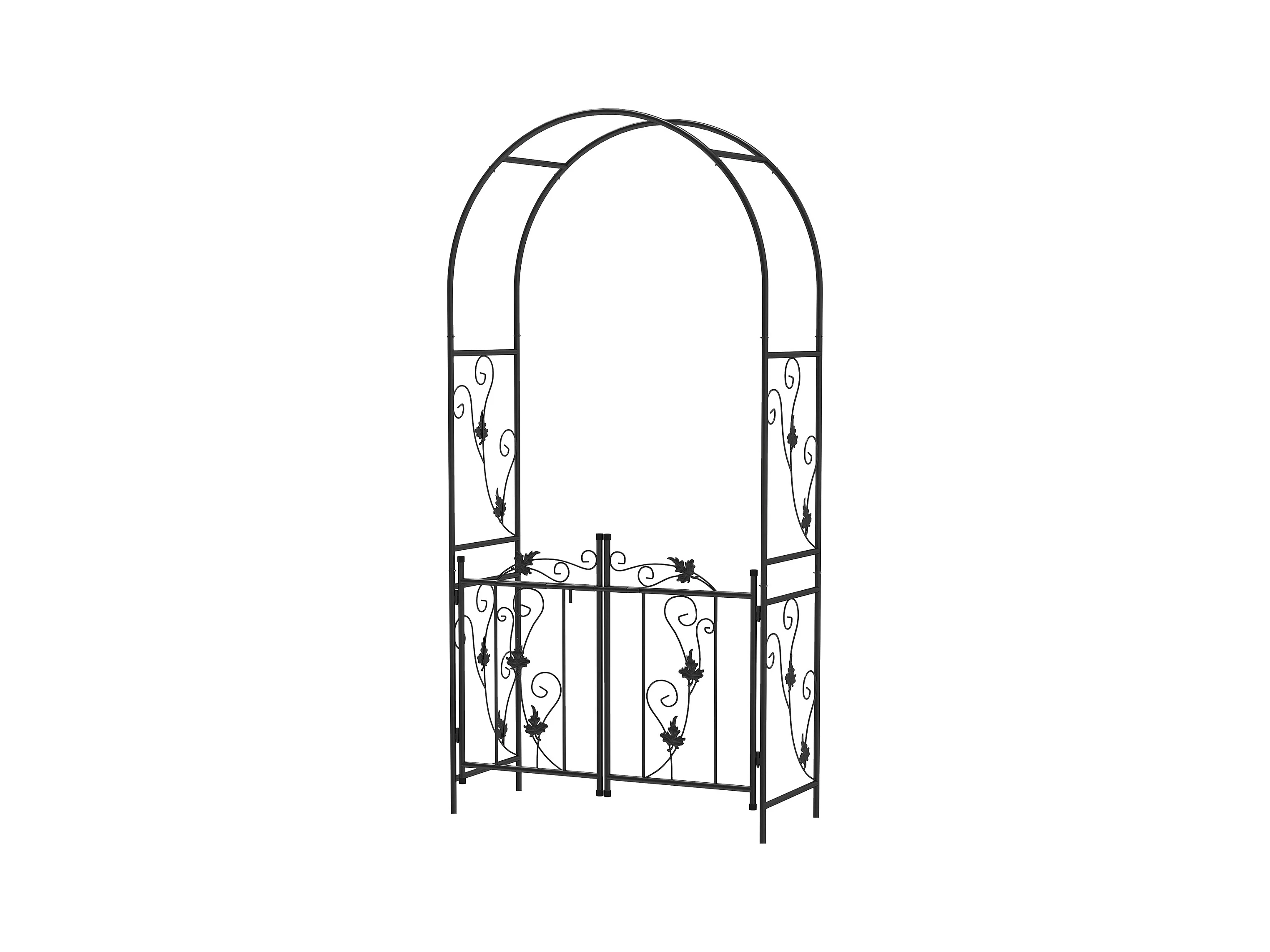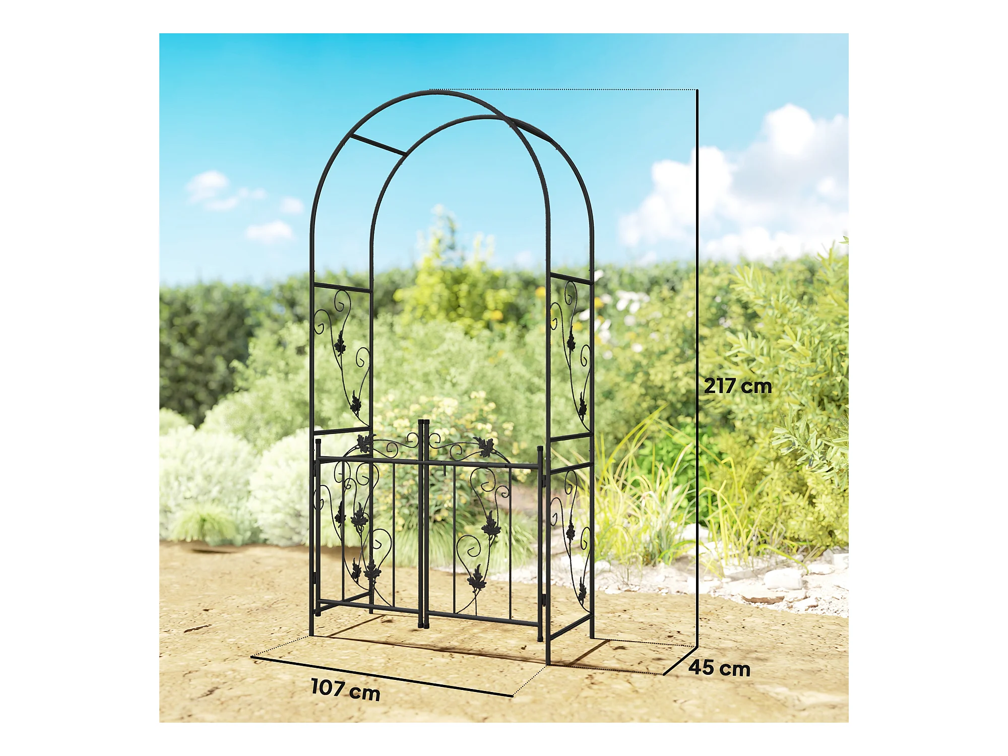 Arche de jardin avec portillon treillis style fer forgé feuilles vigne acier thermolaqué noir