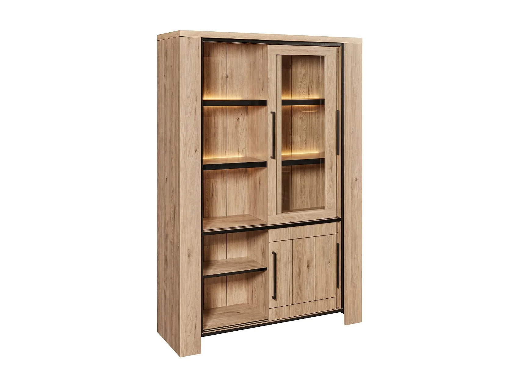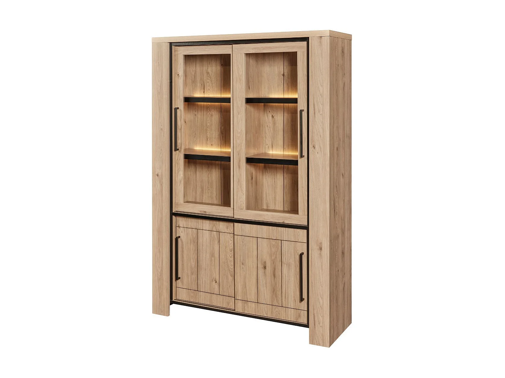 Argentier 4 portes coulissantes dont 2 vitrées avec éclairage leds aspect bois finition Castel Oak - SORIEL