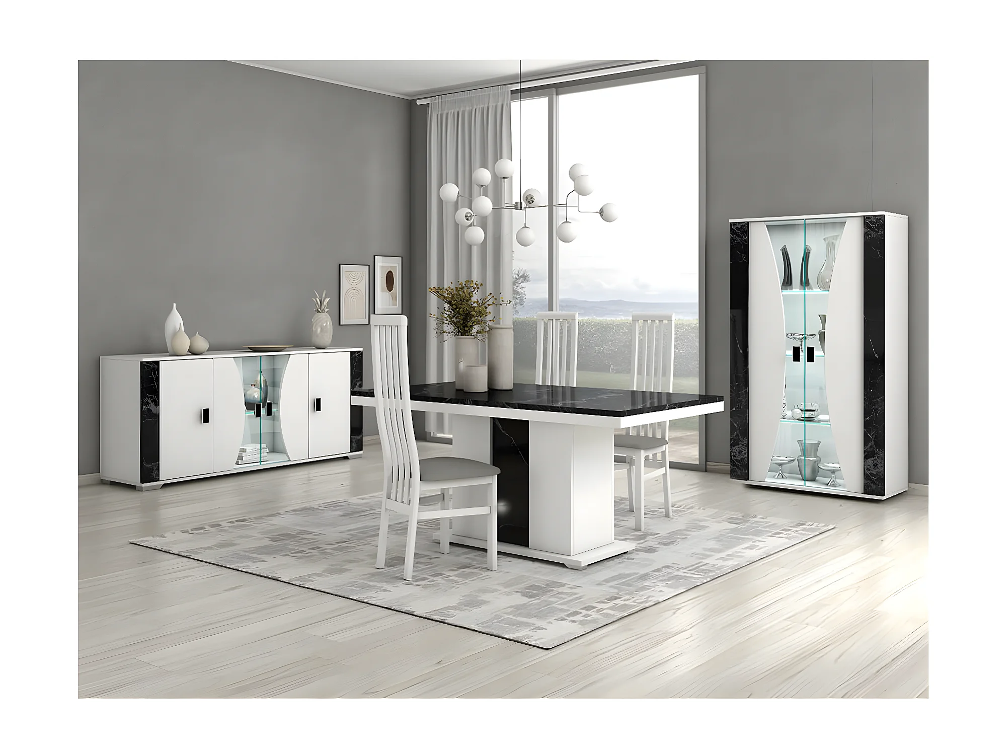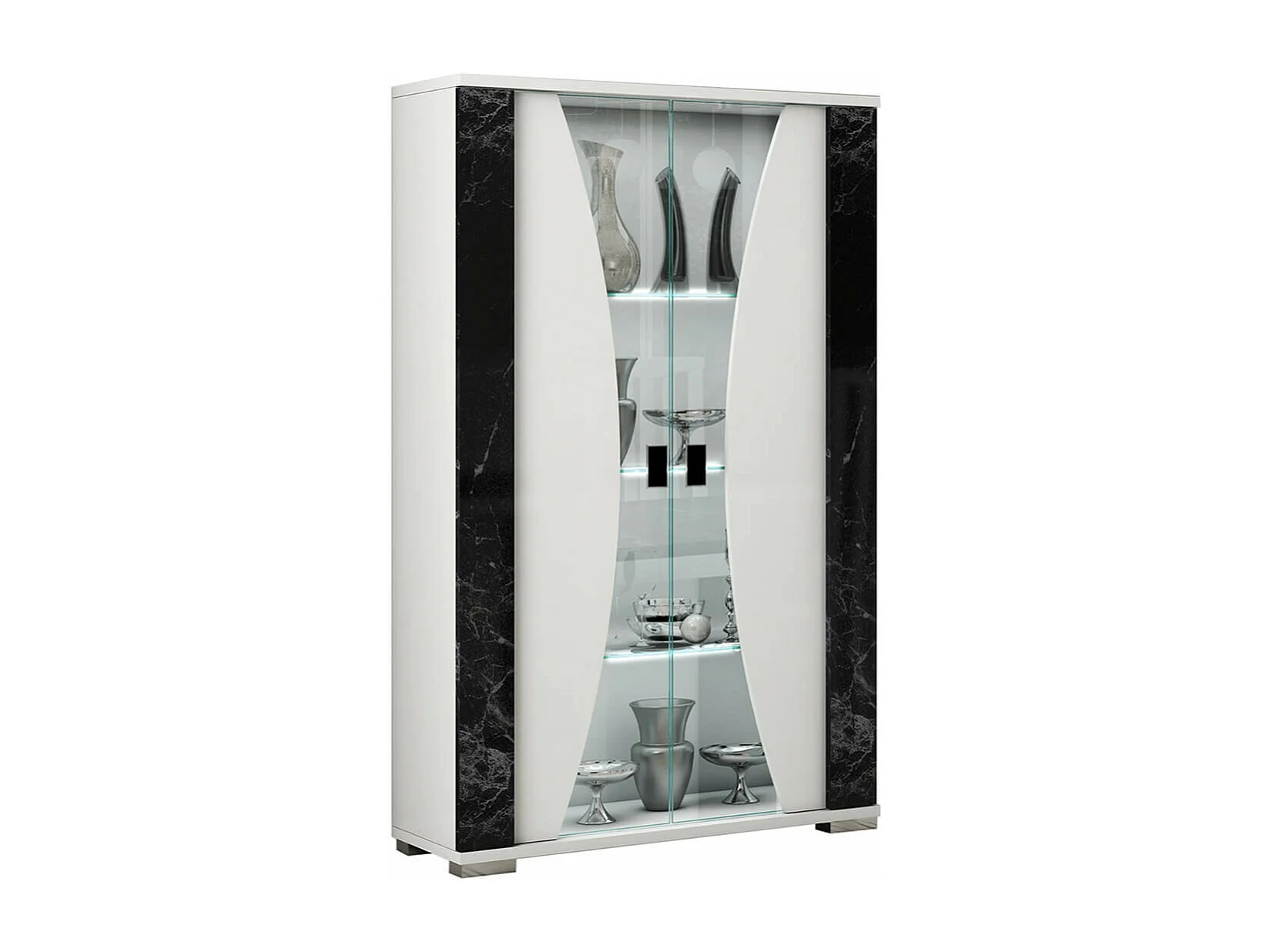 ARIANE - Vitrine 2 Portes Blanc Eclairage Led intégré avec Décor Latéral Aspect Marbre Noir